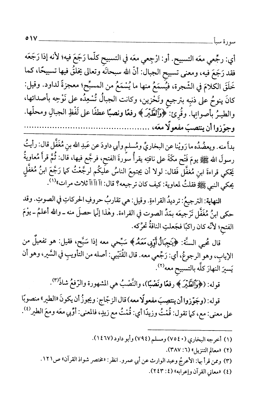 قوله: (وجَوّزوا أن ينتصِبَ مفعولاً معه) قال الزجّاج: ويجوزُ أن يكونَ ((الطير)) منصوبًا على معنى: مع، كما تقول: قَمْتُ وزيدًا أي: قَمْتُ مع زيدٍ، فالمعني: أوِّبي معَه ومعَ الطير.