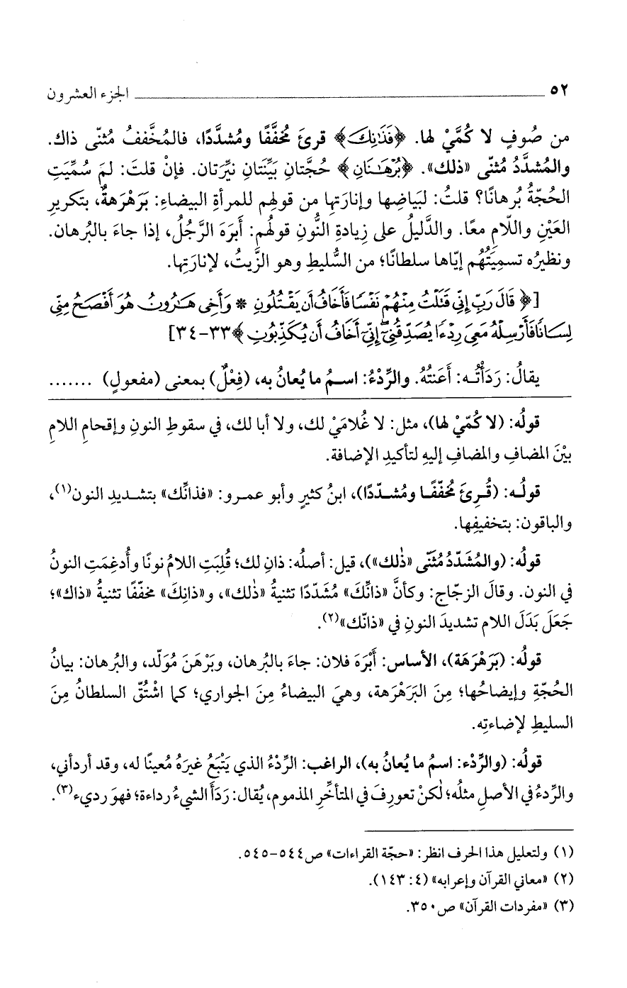 قولُه: (قُرِئَ مُخفّفًا ومُشدّدًا)، ابنُ كثيرٍ وأبو عمرو: ((فذانِّك)) بتشديدِ النون، والباقون: بتخفيفِها.