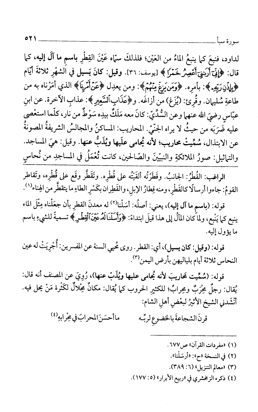 لداود، فنبع كما ينبع الماء من العين؛ فلذلك سماه عين القطر باسم ما آل إليه، كما قال: (إِنِّي أَرانِي أَعْصِرُ خَمْراً)] يوسف: 36 [. وقيل: كان يسيل في الشهر ثلاثة أيام (بِإِذْنِ رَبِّه): بأمره. (وَمَنْ يَزِغْ مِنْهُمْ): ومن يعدل (عَنْ أَمْرِنا) الذي أمرناه به من طاعة سليمان. وقرئ: (يزغ) من أزاغه. و (عذاب السعير): عذاب الآخرة. عن ابن عباس رضى الله عنهما وعن السدى: كان معه ملك بيده سوط من نار، كلما استعصى عليه ضربه من حيث لا يراه الجنى. لمحاريب: المساكن والمجالس الشريفة المصونة عن الابتذال، سميت محاريب؛ لأنه يحامى عليها ويذب عنها. وقيل: هي المساجد. والتماثيل: صور الملائكة والنبيين والصالحين، كانت تعمل في المساجد من نحاس