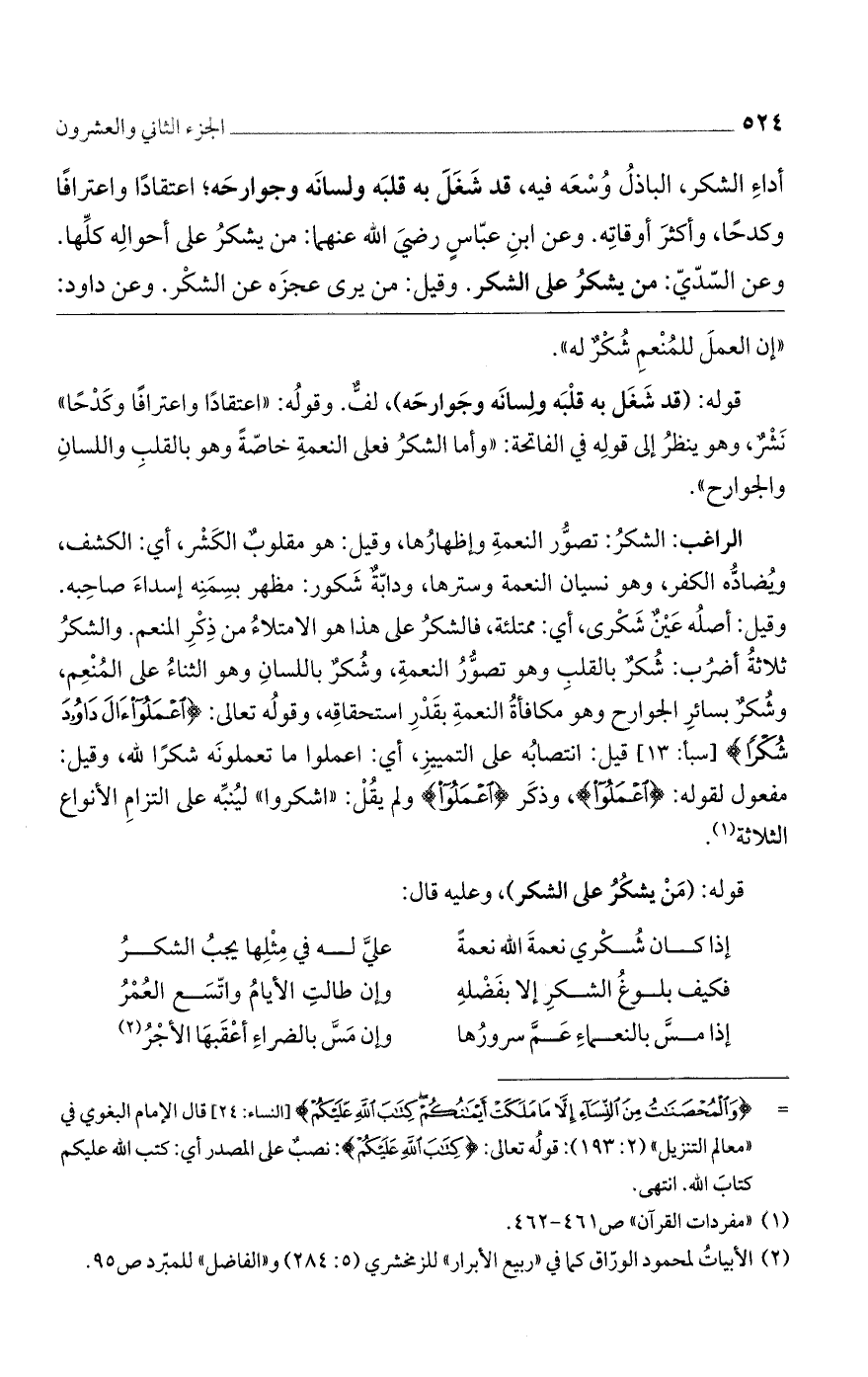 وقيل: أصلُه عَيْنٌ شَكْرى، أي: ممتلئة، فالشكرُ على هذا الامتلاءُ من ذِكْرِ المنعم. والشكرُ ثلاثةُ أضربُ: شُكرٌ بالقلبِ وهو تصوُّرُ النعمةِ، وشُكرٌ باللسانِ وهو الثناءُ على المُنْعِم، وشُكرٌ بسائرِ الجوارح وهو مكافأةُ النعمةِ بقَدْرِ استحقاقِه، وقولُه تعالى: {اعْمَلُوا آلَ دَاوُودَ شُكْرًا} [سبأ: 13] قيل: انتصابُه على التمييزِ، أي: اعملوا ما تعملونَه شكرًا لله، وقيل: مفعول لقوله: {اعْمَلُوا}، وذكَر {اعْمَلُوا} ولم يقُلْ: ((اشكروا)) ليُنبِّه على التزامِ الأنواع الثلاثة.