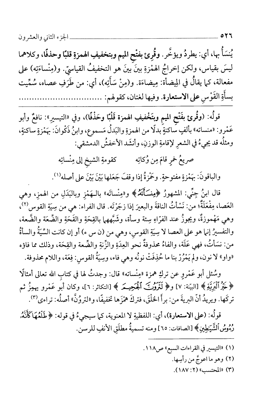 وسُئل أبو عَمْروٍ عن تركِ همزة ((مِنْساته)) قال: وجدتُ لها في كتابِ الله تعالى أمثالاً {خَيْرُ الْبَرِيَّةِ} [البيّنة: 7] و {لَتَرَوُنَّ الْجَحِيمَ} [التكاثر: 6]، وكان أبو عَمْرو ويهمِزُ ثم تركَها. ويريدُ أنّ البريةَ من: برأَ الخلْقَ، فتركَ همْزَها تخفيفًا، و ((الترُونَّ)) أصلُه: تراءى.