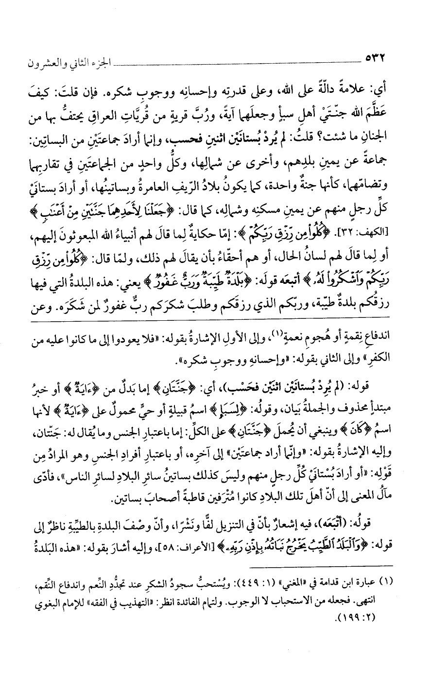 قوله: (لم يُرِدْ بَستانَيْن اثنَيْن فحَسْب)، أي: {جَنَّتَانِ} إما بَدلٌ من {آيَةٌ} أو خبرُ مبتدأٍ محذوف والجملةُ بَيان، وقولُه: {لِسَبَإ} اسمُ قبيلةٍ أو حيٍّ محمولٌ على {آيَةٌ} لأنها اسمُ {كَانَ} وينبغي أن يُحملَ {جَنَّتَانِ} على الكلِّ: إما باعتبارِ الجنس وما يُقال له: جَنّتان، وإليه الإشارةُ بقوله: ((وإنّما أراد جماعتَيْن)) إلى آخرِه، أو باعتبارِ أفرادِ الجنسِ وهو المرادُ مِن قَوْلِه: ((أو أرادَ بُسْتانَيْ كُلِّ رجلٍ منهم وليسَ كذلك بساتينُ سائرِ البلادِ لسائرِ الناس))، فأدّى مآلُ المعنى إلى أنَّ أهلَ تلك البلادِ مُتْرَفين قاطبةً أصحابَ بساتين.