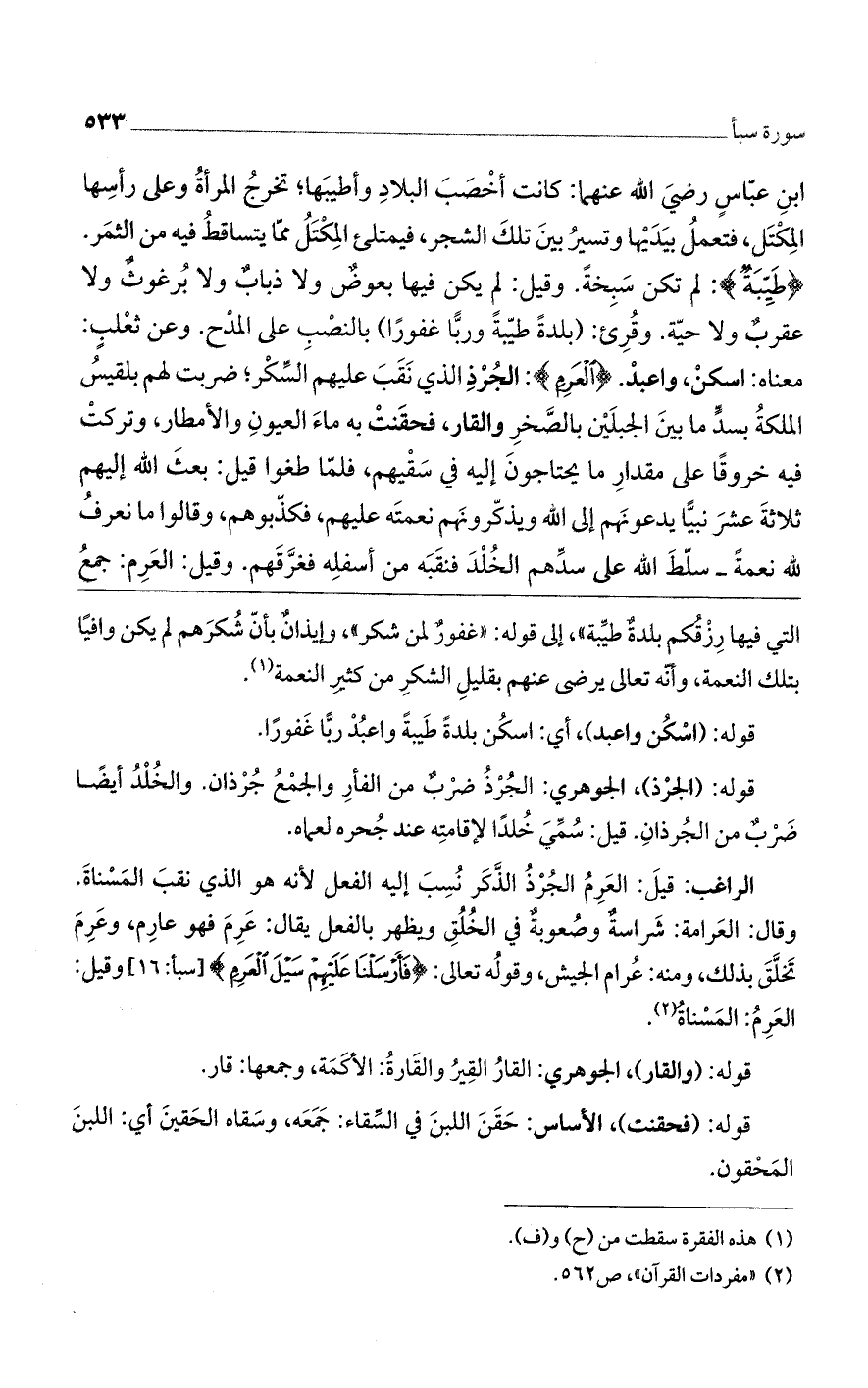 ابن عباس رضي الله عنهما: كانت أخصب البلاد وأطيبها؛ تخرج المرأة وعلى رأسها المكتل، فتعمل بيديها وتسير بين تلك الشجر، فيمتلئ المكتل بما يتساقط فيه من الثمر. (طَيِّبَةٌ): لم تكن سبخة. وقيل: لم يكن فيها بعوض ولا ذباب ولا برغوث ولا عقرب ولا حية. وقرئ: (بلدة طيبة وربا غفورا) بالنصب على المدح. وعن ثعلب: معناه: اسكن، واعبد. (الْعَرِمِ): الجرذ الذي نقب عليهم السكر؛ ضربت لهم بلقيس الملكة بسدّ ما بين الجبلين بالصخر والقار، فحقنت به ماء العيون والأمطار، وتركت فيه خروقًا على مقدار ما يحتاجون إليه في سقيهم، فلما طغوا قيل: بعث الله إليهم ثلاثة عشر نبيًا يدعونهم إلى الله ويذكرونهم نعمته عليهم، فكذبوهم، وقالوا ما نعرف لله نعمة -سلط الله على سدّهم الخلد فنقبه من أسفله فغرقهم. وقيل: العرم: جمع