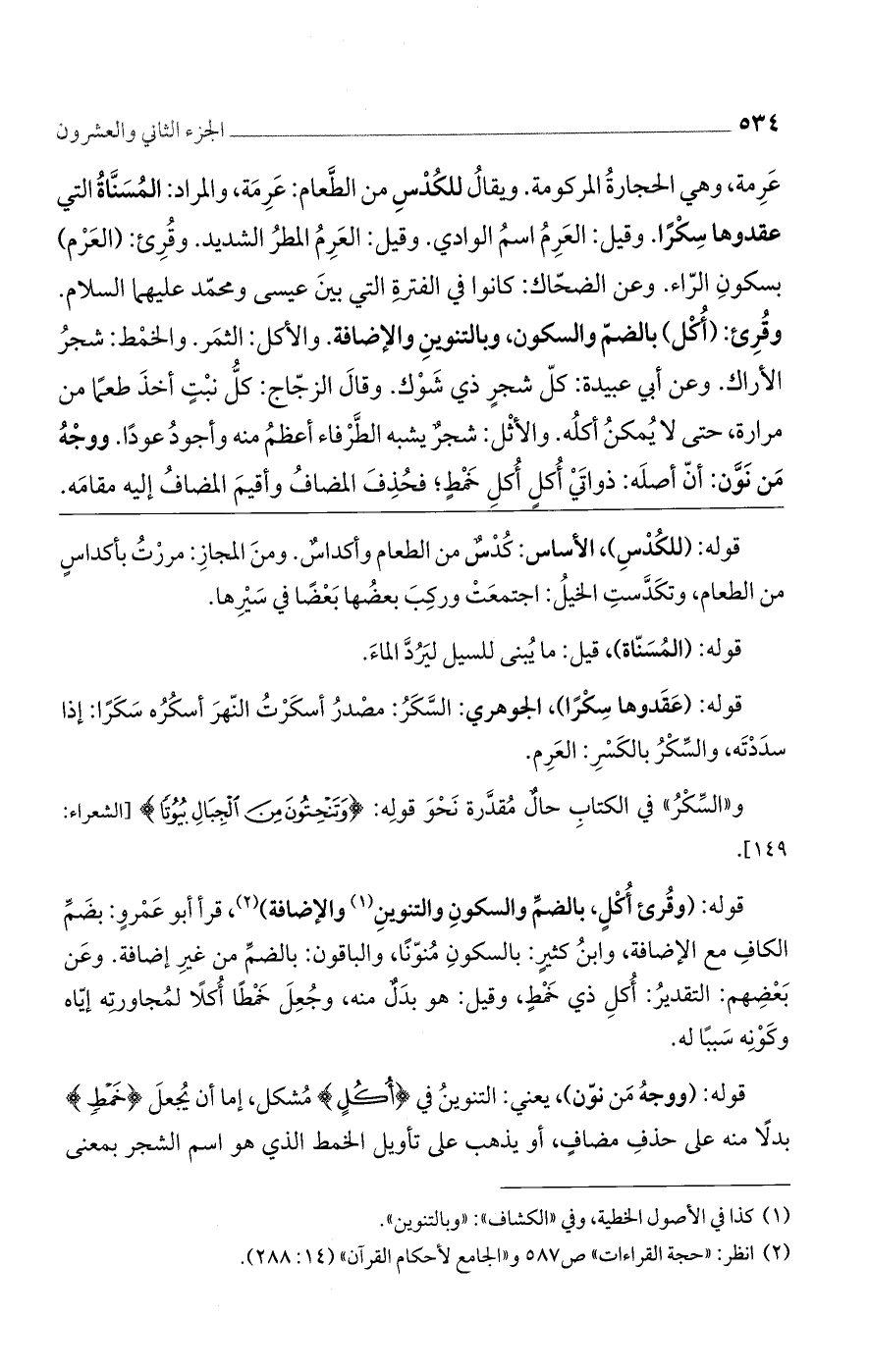 عرمة، وهي الحجارة المركومة. ويقال للكدس من الطعام: عرمة، والمراد: المسناة التي عقدوها سكرًا. وقيل: العرم اسم الوادي. وقيل: العرم المطر الشديد. وقرئ: (العرم) بسكون الراء. وعن الضحاك: كانوا في الفترة التي بين عيسى ومحمد عليهما السلام. وقرئ: (أكل) بالضم والسكون، وبالتنوين والإضافة. والأكل: الثمر. والخمط: شجر الأراك. وعن أبى عبيدة: كل شجر ذى شوك. وقال الزجاج: كل نبت أخذ طعمًا من مرارة، حتى لا يمكن أكله. والأثل: شجر يشبه الطرفاء أعظم منه وأجود عودًا. ووجه من نون: أن أصله: ذواتي أكل أكل خمط؛ فحذف المضاف وأقيم المضاف إليه مقامه.
