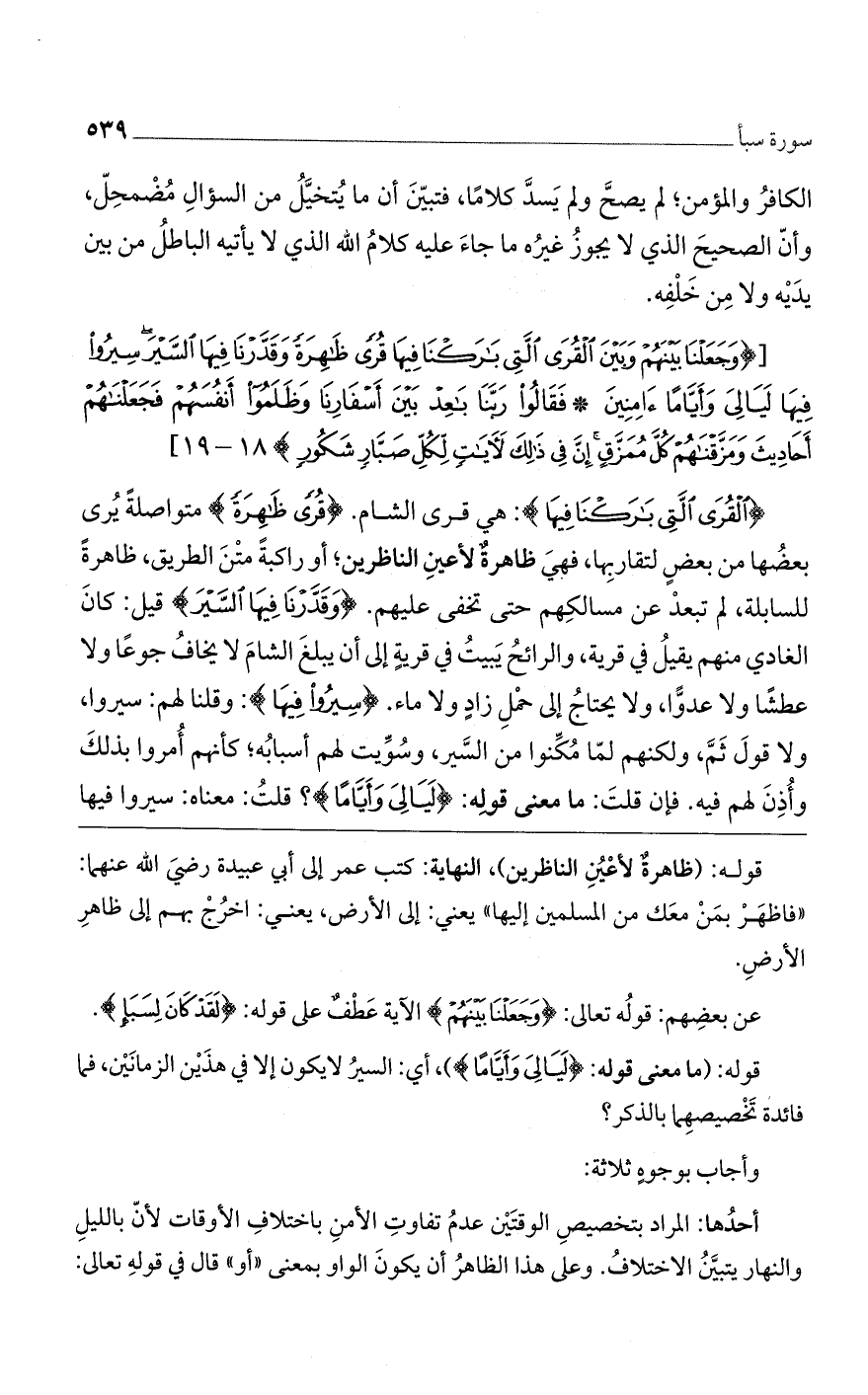 [وَجَعَلْنا بَيْنَهُمْ وَبَيْنَ الْقُرَى الَّتِي بارَكْنا فِيها قُرىً ظاهِرَةً وَقَدَّرْنا فِيهَا السَّيْرَ سِيرُوا فِيها لَيالِيَ وَأَيَّاماً آمِنِينَ (18) فَقالُوا رَبَّنا باعِدْ بَيْنَ أَسْفارِنا وَظَلَمُوا أَنْفُسَهُمْ فَجَعَلْناهُمْ أَحادِيثَ وَمَزَّقْناهُمْ كُلَّ مُمَزَّقٍ إِنَّ فِي ذلِكَ لَآياتٍ لِكُلِّ صَبَّارٍ شَكُورٍ)] 18 - 19 [