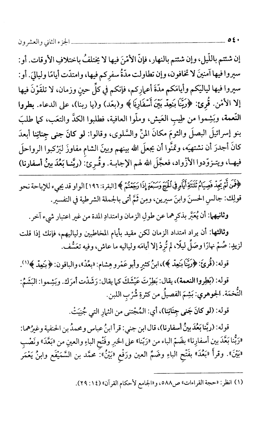 قوله: (ربَّنا بَعُدَ بينُ أسفارنا)، قال ابن جني: قرأ ابنُ عباس ومحمدُ بن الحنفية وغيرُهما: ((رَبُّنا بَعَّدَ بين أسفارِنا)) بضَمّ الباء من ((رَبّنا)) على الخبرِ وفَتْحِ الباءِ والعينِ من ((بَعَّدَ)) ونَصْبِ ((بَيْنَ)). وقرأَ ((بَعُدَ)) بفَتْحِ الباءِ وضَمِّ العين ورَفْعِ ((بَيْنُ)): محمَّد بن السَّمَيْفَع وابنُ يَعْمَر