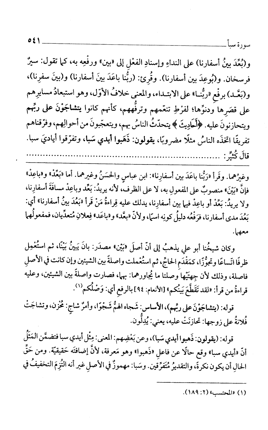 وغيرُهما. وقَرأ: ((رَبُّنا باعَدَ بين أسفارِنا)): ابن عباسِ والحسَنُ وغيرهما. أما ((بَعِّدْ)) و ((باعِدْ)) فإنَّ ((بَيْنَ)) منصوبٌ على المفعولِ به، لا على الظرف، لأنه يريدُ: بَعِّد وباعِدْ مسافَةَ أسفارِنا، ولا يريدُ: بَعِّدْ أو باعِدْ فيما بين أسفارِنا، بذلك عليه قِراءةُ مَنْ قَرأ ((بَعُدَ بينُ أسفارنا)) أي: بَعُدَ مدى أسفارنا، فرَفْعُه دليلُ كونِه اسمًا، ولأنّ ((بعَّد)) و ((باعَد)) فِعلانِ مُتعدِّيان، فمفعولُهما معهما.
