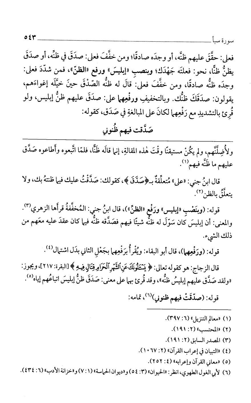 قال الزجاج: هو كقوله تعالى: {يَسْأَلُونَكَ عَنِ الشَّهْرِ الْحَرَامِ قِتَالٍ فِيهِ} [البقرة: 217]، ويجوز: ((ولقد صَدَّق عليهم إبليسُ ظنُّه))، وقد قُرئ بهما على معنى: صَدَقَ ظنُّ إبليسَ اتباعُهم إياه.