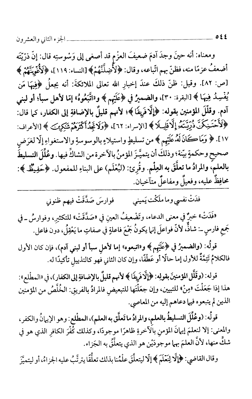 قوله: (وقُلَّل المؤمنينَ بقولِه: {إِلاَّ فَريقًا} لأنهم قليلٌ بالإضافةِ إلى الكفار)، في ((المطْلع)): هذا إذا جَعَلْتَ ((مِنْ)) للتبين، وإن جعَلْتَها للتبعيضِ فالمرادُ بالفريقِ: الخُلَّصُ من المؤمنين الذين لم يتبعوه فيما دعاهم إليه من المعاصي.