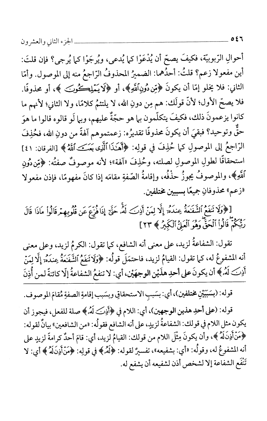 تقول: الشفاعة لزيد، على معنى أنه الشافع، كما تقول: الكرم لزيد، وعلى معنى أنه المشفوع له، كما تقول: القيام لزيد، فاحتمل قوله: (وَلا تَنْفَعُ الشَّفاعَةُ عِنْدَهُ إِلَّا لِمَنْ أَذِنَ لَهُ) أن يكون على أحد هذين الوجهين، أى: لا تنفع الشفاعة إلا كائنة لمن أذن
