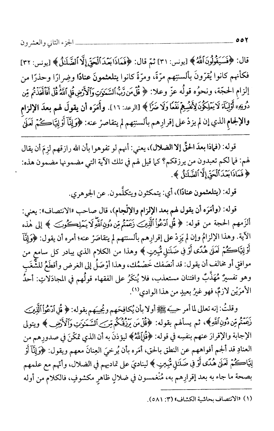 قال: (فَسَيَقُولُونَ الله)] يونس: 31 [ثم قال: (فَماذا بَعْدَ الْحَقِّ إِلَّا الضَّلالُ)] يونس: 32 [فكأنهم كانوا يقرّون بألسنتهم مرّة، ومرّة كانوا يتلعثمون عنادًا وضرارًا وحذارًا من إلزام الحجة، ونحوه قوله عزّ وعلا: (قُلْ مَنْ رَبُّ السَّماواتِ وَالْأَرْضِ قُلِ الله قُلْ أَفَاتَّخَذْتُمْ مِنْ دُونِهِ أَوْلِياءَ لا يَمْلِكُونَ لِأَنْفُسِهِمْ نَفْعاً وَلا ضَرًّا)] الرعد: 16 [. وأمره أن يقول لهم بعد الإلزام والإلجام الذي إن لم يزد على إقرارهم بألسنتهم لم يتقاصر عنه: (وَإِنَّا أَوْ إِيَّاكُمْ لَعَلى