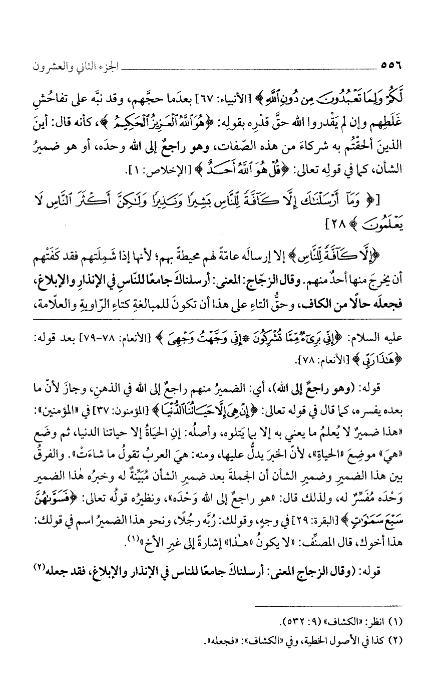 قوله: (وقال الزجاج المعنى: أرسلناكَ جامعًا للناس في الإنذار والإبلاغ، فقد جعله