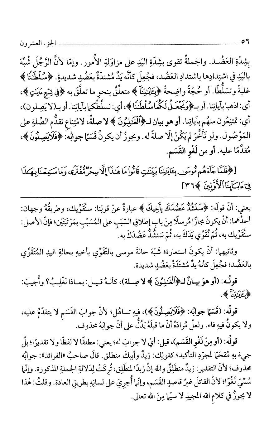 بِشِدّةِ العَضُد. والجملةُ تقوي بشِدّةِ اليَدِ على مزاوَلةِ الأُمور. وإمّا لأنَّ الرَّجُلَ شُبِّهَ باليَدِ في اشتِدادِها باشتدادِ العَضُد، فجُعِلَ كأنَّه يَدٌ مُشتدّةٌ بعَضُدٍ شديدةٍ. {سُلْطَانًا} غلبةً وتسَلُّطًا. أو حُجّةً واضِحةً {بِئَايَتِنَا} متعلِّقٌ بنحوِ ما تعلَّقَ به {فِي تِسْعِ آيَاتٍ}، أي: اذهبا بآياتِنا. أو بـ {وَنَجْعَلُ لَكُمَا سُلْطَانًا}، أي: نسلِّطُكما بآياتِنا. أو بـ (لا يَصِلون)، أي: تمتنِعُون منهُم بآياتِنا. أو هو بيان لـ {اَلْغَالِبُونَ} لا صلةٌ، لامْتِناعِ تقدُّم الصِّلةِ على المَوْصُول. ولو تَأَخَّرَ لم يَكُنْ إلاّ صلةً له. ويجوزُ أن يكونُ قَسَمًا جوابُه: {فَلاَ يَصِلُونَ}، مُقدَّمًا عليه. أو من لَغْوِ القَسَم.