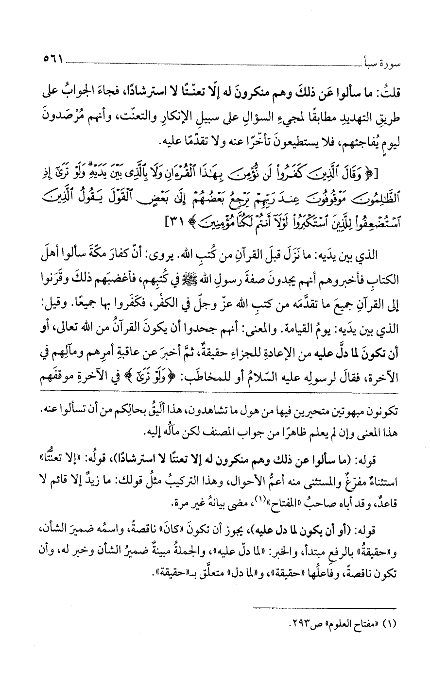 [وَقالَ الَّذِينَ كَفَرُوا لَنْ نُؤْمِنَ بِهذَا الْقُرْآنِ وَلا بِالَّذِي بَيْنَ يَدَيْهِ وَلَوْ تَرى إِذِ الظَّالِمُونَ مَوْقُوفُونَ عِنْدَ رَبِّهِمْ يَرْجِعُ بَعْضُهُمْ إِلى بَعْضٍ الْقَوْلَ يَقُولُ الَّذِينَ اسْتُضْعِفُوا لِلَّذِينَ اسْتَكْبَرُوا لَوْلا أَنْتُمْ لَكُنَّا مُؤْمِنِينَ)] 31 [