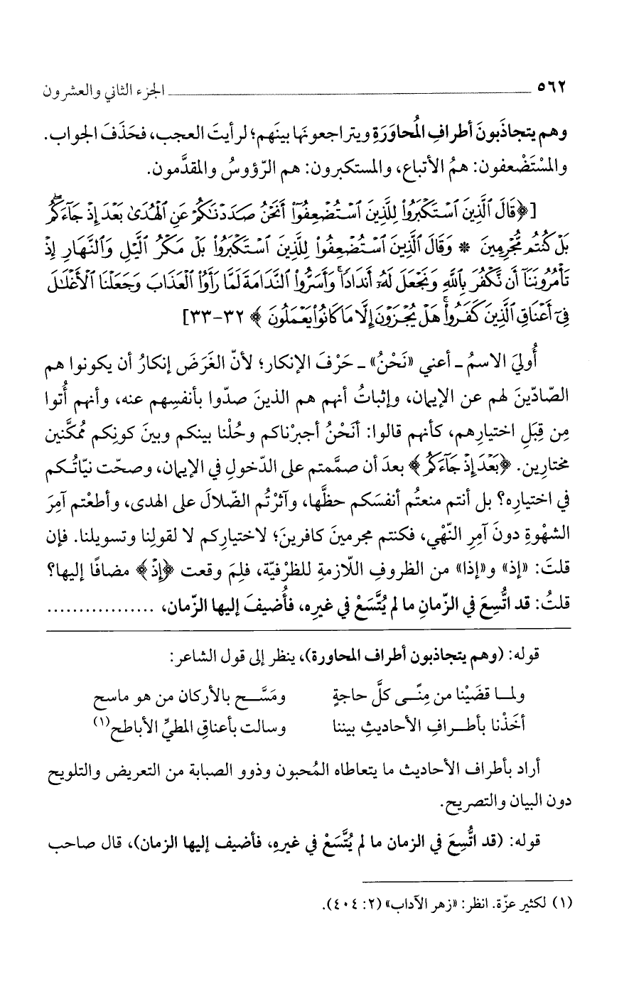 (قالَ الَّذِينَ اسْتَكْبَرُوا لِلَّذِينَ اسْتُضْعِفُوا أَنَحْنُ صَدَدْناكُمْ عَنِ الْهُدى بَعْدَ إِذْ جاءَكُمْ بَلْ كُنْتُمْ مُجْرِمِينَ (32) وَقالَ الَّذِينَ اسْتُضْعِفُوا لِلَّذِينَ اسْتَكْبَرُوا بَلْ مَكْرُ اللَّيْلِ وَالنَّهارِ إِذْ تَامُرُونَنا أَنْ نَكْفُرَ بِالله وَنَجْعَلَ لَهُ أَنْداداً وَأَسَرُّوا النَّدامَةَ لَمَّا رَأَوُا الْعَذابَ وَجَعَلْنَا الْأَغْلالَ فِي أَعْناقِ الَّذِينَ كَفَرُوا هَلْ يُجْزَوْنَ إِلاَّ ما كانُوا يَعْمَلُونَ)] 32 - 33 [