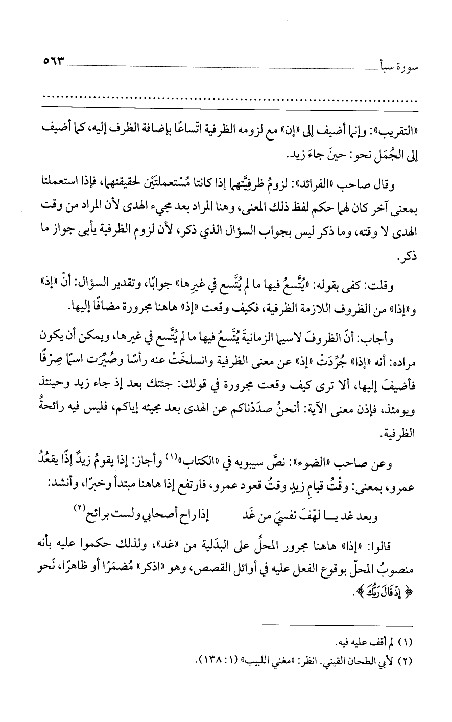 وأجاب: أنّ الظروفَ لا سيما الزمانيةَ يُتَّسعُ فيها ما لم يُتَّسع في غيرها، ويمكن أن يكون مراده: أنه ((إذا)) جُرِّدَتْ ((إذ)) عن معنى الظرفية وانسلخَتْ عنه رأسًا وصُيِّرَت اسمًا صِرْفًا فأضيفَ إليها، ألا ترى كيف وقعت مجرورة في قولك: جئتك بعد إذ جاء زيد وحينئذ ويومئذ، فإذن معنى الآية: أنحنُ صدَدْناكم عن الهدى بعد مجيئه إياكم، فليس فيه رائحةُ الظرفية.