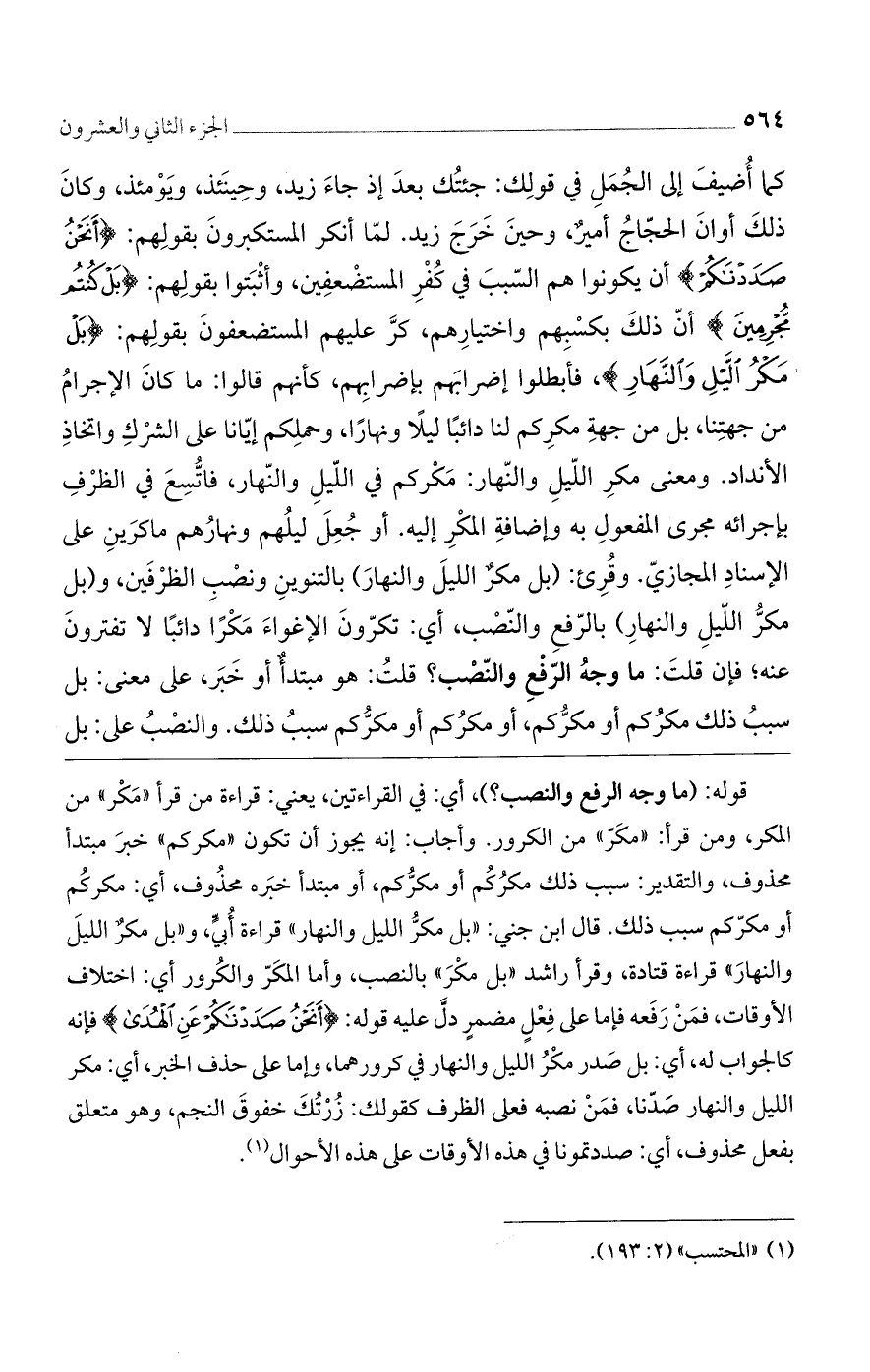 كما أضيف إلى الجمل في قولك: جئتك بعد إذ جاء زيد، وحينئذ، ويومئذ، وكان ذلك أوان الحجاج أمير، وحين خرج زيد. لما أنكر المستكبرون بقولهم: (أَنَحْنُ صَدَدْناكُمْ) أن يكونوا هم السبب في كفر المستضعفين، وأثبتوا بقولهم: (بَلْ كُنْتُمْ مُجْرِمِينَ) أن ذلك بكسبهم واختيارهم، كرّ عليهم المستضعفون بقولهم: (بَلْ مَكْرُ اللَّيْلِ وَالنَّهار)، فأبطلوا إضرابهم بإضرابهم، كأنهم قالوا: ما كان الإجرام من جهتنا، بل من جهة مكركم لنا دائبًا ليلًا ونهارًا، وحملكم إيانا على الشرك واتخاذ الأنداد. ومعنى مكر الليل والنهار: مكركم في الليل والنهار، فاتسع في الظرف بإجرائه مجرى المفعول به وإضافة المكر إليه. أو جعل ليلهم ونهارهم ماكرين على الإسناد المجازى. وقرئ: (بل مكر الليل والنهار) بالتنوين ونصب الظرفين، و (بل مكرّ الليل والنهار) بالرفع والنصب، أى: تكرّون الإغواء مكرًّا دائبًا لا تفترون عنه؛ فإن قلت: ما وجه الرفع والنصب؟ قلت: هو مبتدأ أو خبر، على معنى: بل سبب ذلك مكركم أو مكرّكم، أو مكركم أو مكرّكم سبب ذلك. والنصب على: بل