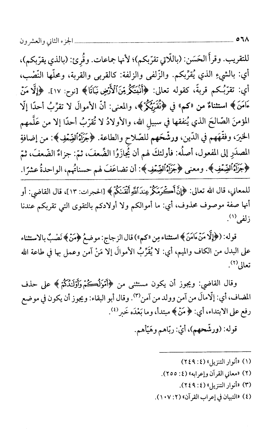 للتقريب. وقرأ الحسن: (باللاتى تقرّبكم)؛ لأنها جماعات. وقرئ: (بالذي يقرّبكم)، أى: بالشيء الذي يقرّبكم. والزلفى والزلفة: كالقربى والقربة، ومحلها النصب، أى: تقرّبكم قربة، كقوله تعالى: (أَنْبَتَكُمْ مِنَ الْأَرْضِ نَباتاً)] نوح: 17 [. (إِلَّا مَنْ آمَنَ) استثناء من «كم» في (تُقَرِّبُكُمْ)، والمعنى: أنّ الأموال لا تقرب أحدًا إلا المؤمن الصالح الذي ينفقها في سبيل الله، والأولاد لا تقرب أحدًا إلا من علمهم الخير وفقههم في الدين، ورشحهم للصلاح والطاعة. (جزاء الضِّعْفِ): من إضافة المصدر إلى المفعول، أصله: فأولئك لهم أن يجازوا الضعف، ثم: جزاء الضعف، ثم (جزاء الضعف). ومعنى (جزاء الضعف): أن تضاعف لهم حسناتهم، الواحدة عشراً.