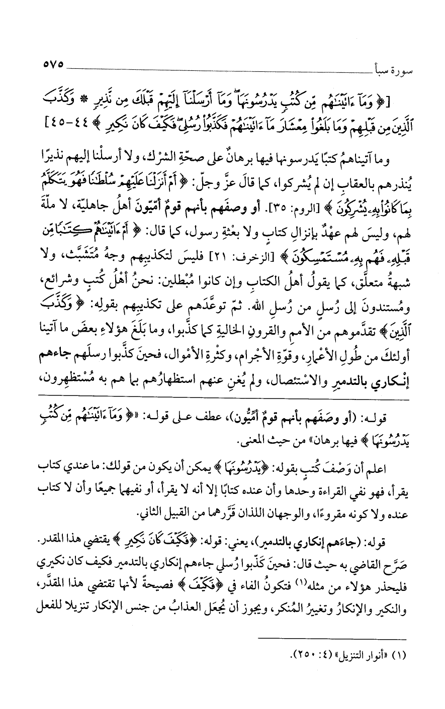 وما آتيناهم كتبًا يدرسونها فيها برهان على صحة الشرك، ولا أرسلنا إليهم نذيرًا ينذرهم بالعقاب إن لم يشركوا، كما قال عز وجل: (أَمْ أَنْزَلْنا عَلَيْهِمْ سُلْطاناً فَهُوَ يَتَكَلَّمُ بِما كانُوا بِهِ يُشْرِكُونَ)] الروم: 35 [. أو وصفهم بأنهم قوم أمّيون أهل جاهلية، لا ملة لهم وليس لهم، عهد بإنزال كتاب ولا بعثة رسول، كما قال: (أَمْ آتَيْناهُمْ كِتاباً مِنْ قَبْلِهِ فَهُمْ بِهِ مُسْتَمْسِكُونَ)] الزخرف: 21 [فليس لتكذيبهم وجه متشبث، ولا شبهة متعلق، كما يقول أهل الكتاب وإن كانوا مبطلين: نحن أهل كتب وشرائع، ومستندون إلى رسل من رسل الله. ثم توعدهم على تكذيبهم بقوله: (وَكَذَّبَ الَّذِينَ) تقدّموهم من الأمم والقرون الخالية كما كذبوا، وما بلغ هؤلاء بعض ما آتينا أولئك من طول الأعمار، وقوّة الأجرام، وكثرة الأموال، فحين كذبوا رسلهم جاءهم إنكارى بالتدمير والاستئصال، ولم يغن عنهم استظهارهم بما هم به مستظهرون،