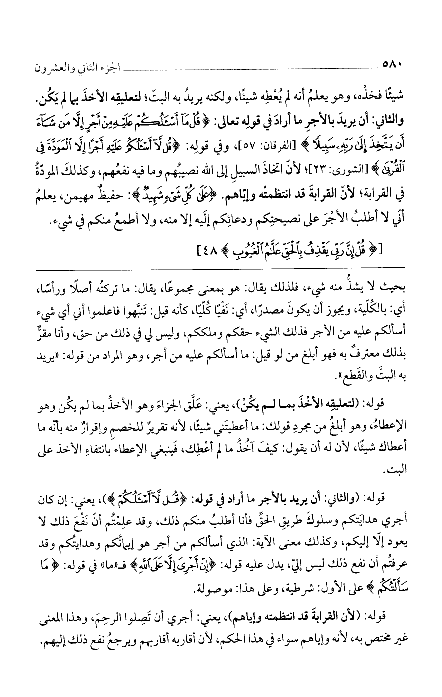 قوله: (والثاني: أن يريد بالأجر ما أراد في قوله: {قُل لَّا أَسْئَلُكُمْ})، يعني: إن كان أجري هدايَتكم وسلوكَ طريقِ الحقِّ فأنا أطلبُ منكم ذلك، وقد علِمْتُم أنّ نَفْعَ ذلك لا يعود إلاّ إليكم، وكذلك معنى الآية: الذي أسألكم من أجر هو إيمانُكم وهدايتُكم وقد عرفتُم أن نفع ذلك ليس إليّ، يدل عليه قوله: {إِنْ أَجْرِيَ إِلَّا عَلَى اللَّهِ} فـ ((ما)) في قوله: {مَا سَأَلْتُكُم} على الأول: شرطية، وعلى هذا: موصولة.