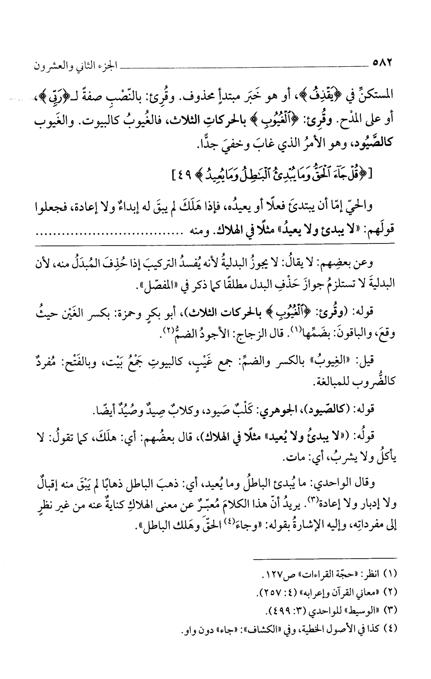 وقال الواحدي: ما يُبدئ الباطلُ وما يُعيد، أي: ذهبَ الباطل ذهابًا لم يَبْقَ منه إقبالٌ ولا إدبار ولا إعادة. يريدُ أنّ هذا الكلامَ عن معنى الهلاكِ كنايةٌ عنه من غير نظرٍ إلى مفرداتِه، وإليه الإشارةُ بقوله: ((وجاءَ الحقّ وهَلك الباطل)).