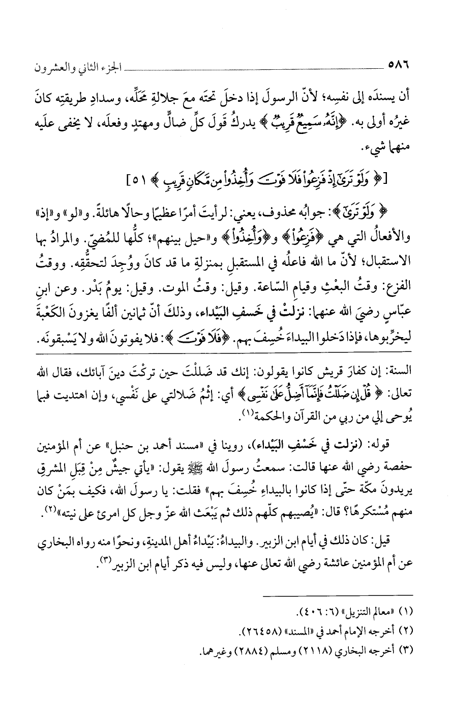 قوله: (نزلت في خَسْفِ البَيْداء)، روينا في ((مسند أحمد بن حنبل)) عن أم المؤمنين حفصة رضي الله عنها قالت: سمعتُ رسولَ الله صلى الله عليه وسلم يقول: ((يأتي جيشٌ مِنْ قِبَلِ المشرقِ يريدونَ مكّة حتّى إذا كانوا بالبيداءِ خُسِفَ بهم)) فقلت: يا رسولَ الله، فكيف بمَنْ كان منهم مُسْتكرهًا؟ قال: ((يُصيبهم كلّهم ذلك ثم يَبْعَث الله عزّ وجل كل امرئ على نيته)).