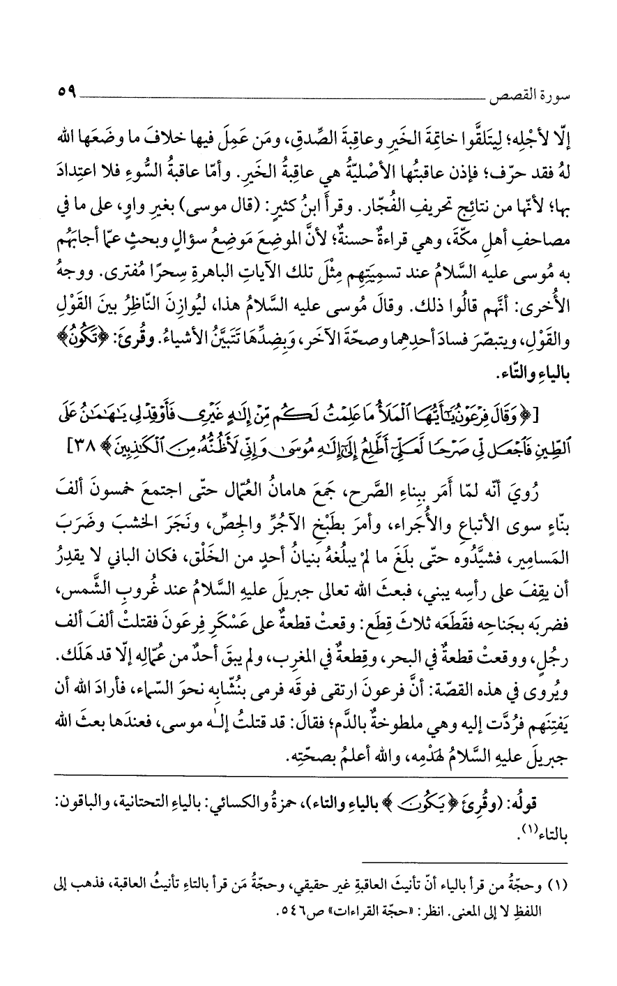 إلاّ لأجْلِه؛ لِيتَلقَّوا خاتِمةَ الخَيرِ وعاقِبةَ الصِّدقِ، ومَن عَمِلَ فيها خلافَ ما وضَعَها الله لهُ فقد حرّف؛ فإذن عاقبتُها الأصْليّةُ هي عاقِبةُ الخَيرِ. وأمّا عاقبةُ السُّوءِ فلا اعتِدادَ بها؛ لأنّها من نتائِج تحريفِ الفُجّار. وقرأَ ابنُ كثيرٍ: (قال موسى) بغيرِ واوٍ، على ما في مصاحفِ أهلِ مكّةَ، وهي قراءةٌ حسنةٌ؛ لأنَّ الموضِعَ مَوضِعُ سؤالٍ وبحثٍ عمّا أجابَهُم به مُوسى عليه السَّلامُ عند تسمِيتَهِم مِثْلَ تلك الآياتِ الباهرةِ سِحرًا مُفترى. ووجهُ الأُخرى: أنَّهم قالُوا ذلك. وقالَ مُوسى عليه السَّلامُ هذا، ليُوازِنَ النّاظِرُ بينَ القَوْلِ والقَوْلِ، ويتبصّرَ فسادَ أحدِهِما وصحّةَ الآخَر، وَبِضِدِّهَا تَتَبيَّنُ الأشياءُ. وقُرئَ: {تَكُونُ} بالياءِ والتّاء.