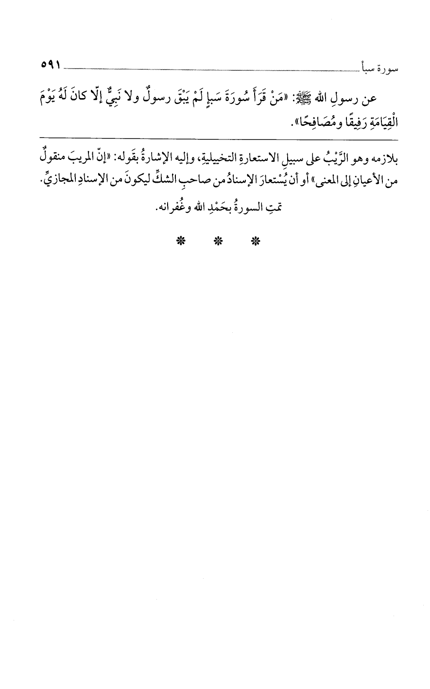 عن رسول الله صلى الله عليه وسلم: «من قرأ سورة سبأ لم يبق رسول ولا نبىّ إلا كان له يوم القيامة رفيقاً ومصافحاً».
