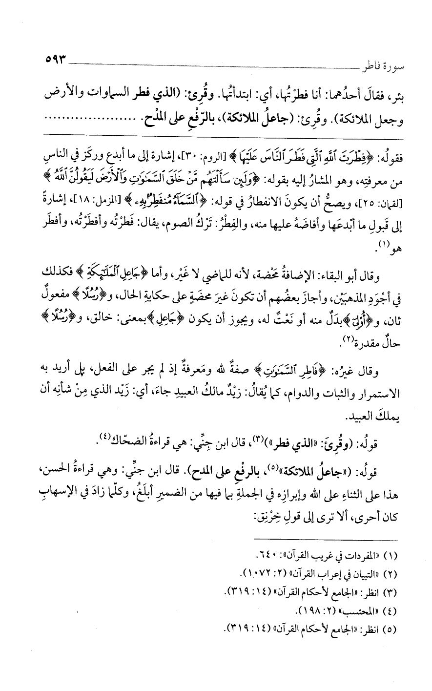 قولُه: (((جاعلُ الملائكة))، بالرفْعِ على المدح). قال ابن جنِّي: وهي قراءةُ الحسن، هذا على الثناءِ على الله وإبرازِه في الجملةِ بما فيها من الضميرِ أبلَغُ، وكلّما زادَ في الإسهاب كان أحرى، ألا ترى إلى قولِ خِرْنِق:
