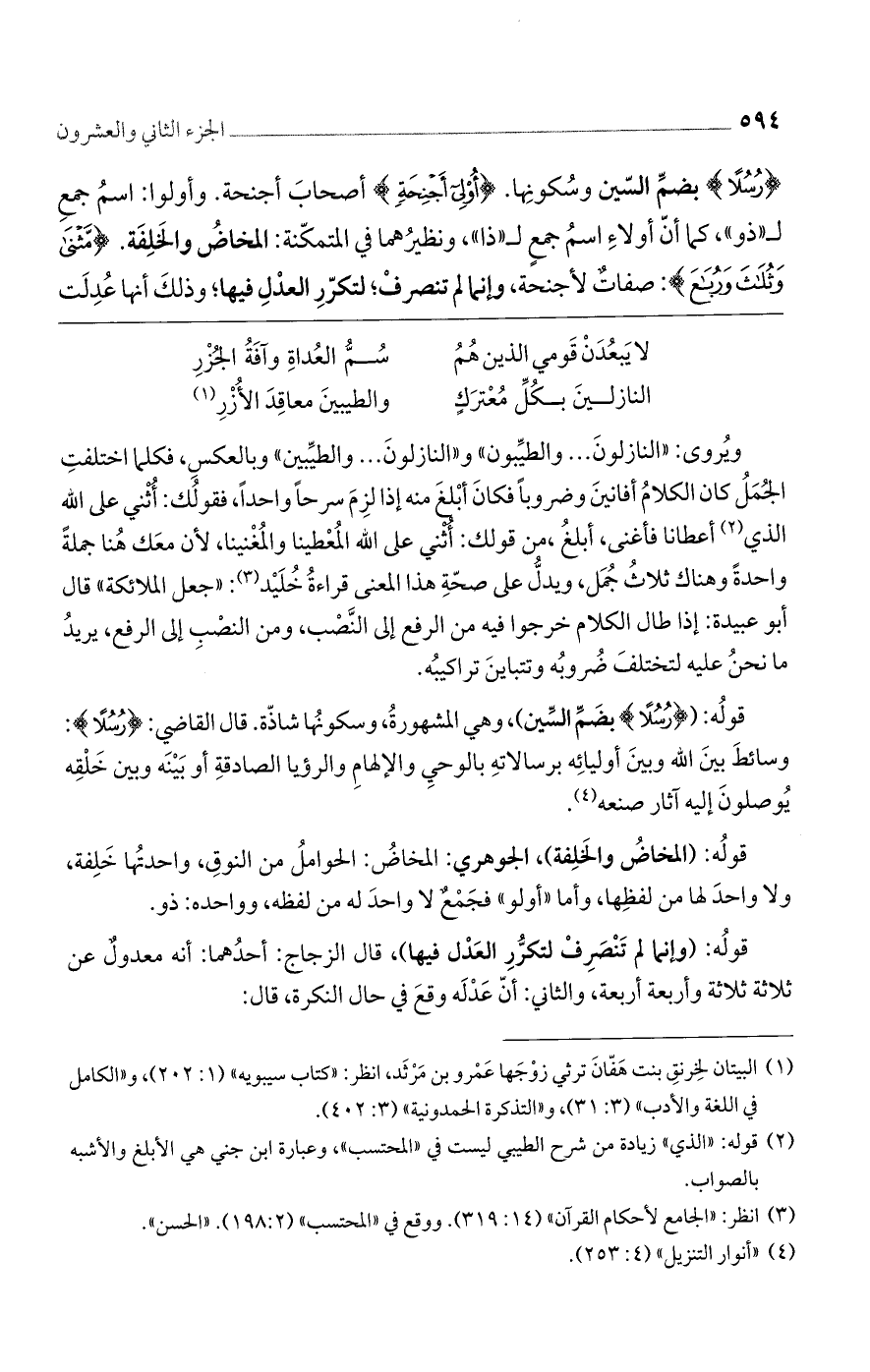 (رُسُلًا) بضم السين وسكونها. (أُولِي أَجْنِحَةٍ) أصحاب أجنحة. وأولوا: اسم جمع لـ"ذو"، كما أن أولاء اسم جمع لـ"ذا"، ونظيرهما في المتمكنة: المخاض والخلفة. (مَثْنى وَثُلاثَ وَرُباعَ): صفات لأجنحة، وإنما لم تنصرف؛ لتكرر العدل فيها؛ ذلك أنها عدلت
