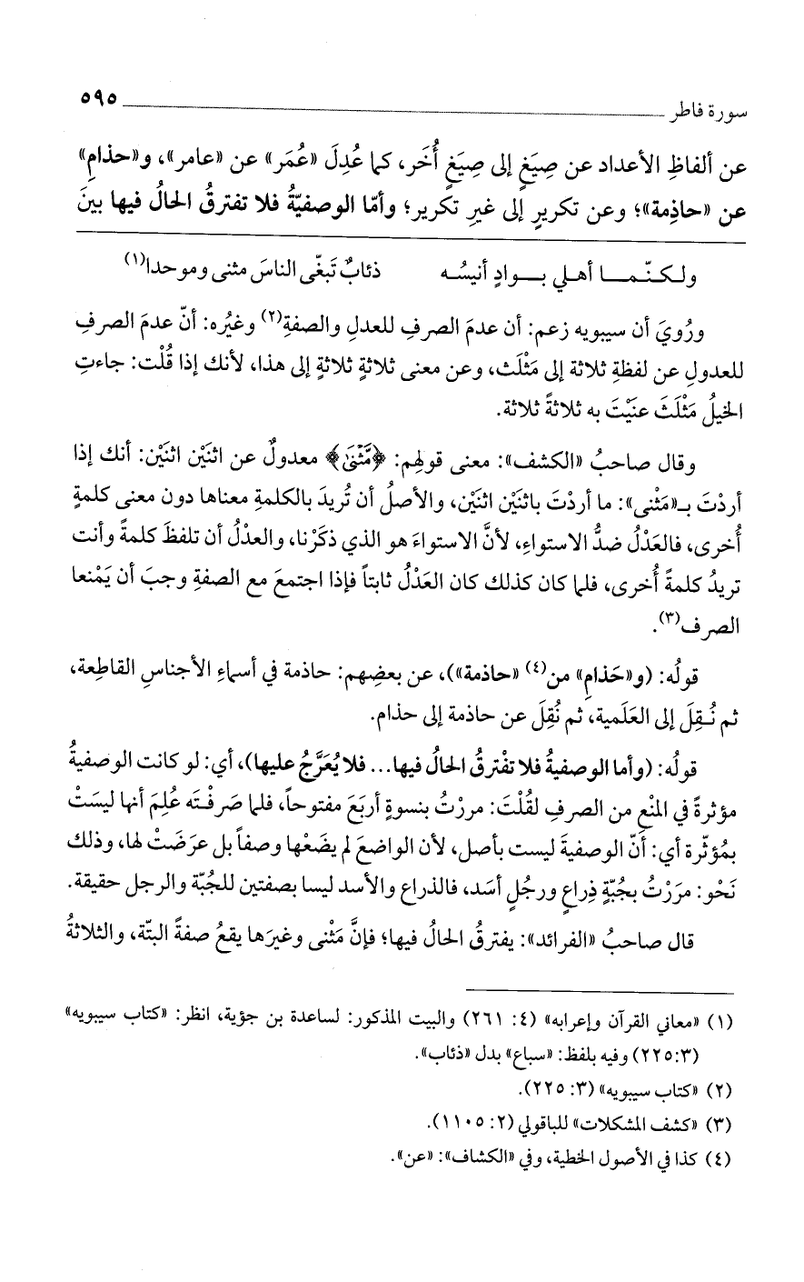وقال صاحبُ ((الكشف)): معنى قولِهم: {مَّثْنَى} معدولٌ عن اثنَيْن اثنَيْن: أنك إذا أردْتَ بـ ((مَثْنى)): ما أردْتَ باثنَيْن اثنَيْن، والأصلُ أن تُريدَ بالكلمةِ معناها دون معنى كلمةٍ أُخرى، فالعَدْلُ ضدُّ الاستواءِ، لأنَّ الاستواءَ هو الذي ذكَرْنا، والعدْلُ أن تلفظَ كلمةً وأنت تريدُ كلمةً أُخرى، فلما كان كذلك كان العَدْلُ ثابتًا فإذا اجتمعَ مع الصفةِ وجبَ أن يَمْنعا الصرف.
