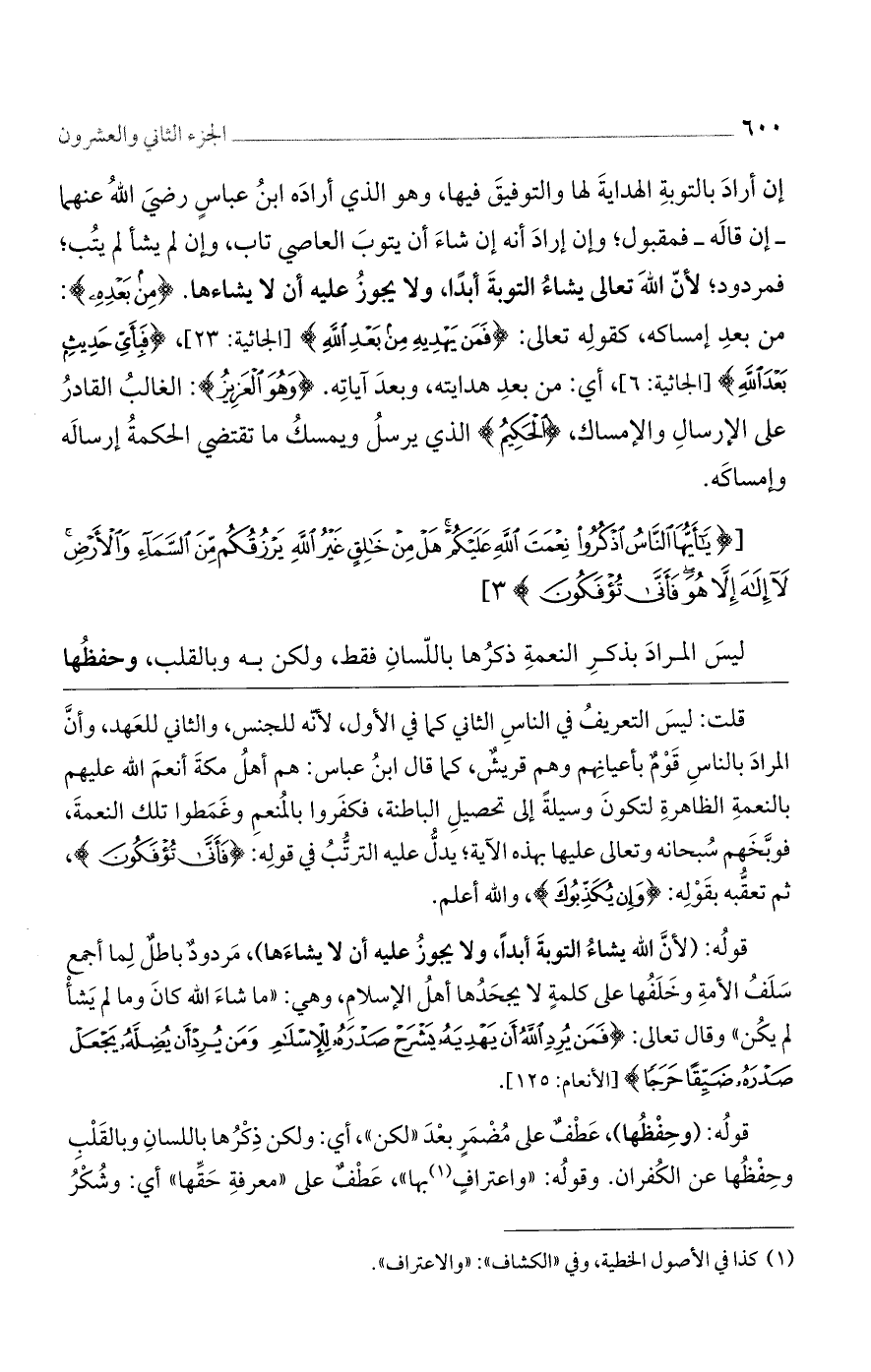 إن أراد بالتوبة الهداية لها والتوفيق فيها، وهو الذي أراده ابن عباس رضى الله عنهما -إن قاله- فمقبول؛ وإن أراد أنه إن شاء أن يتوب العاصي تاب، وإن لم يشأ لم يتب؛ فمردود؛ لأنّ الله تعالى يشاء التوبة أبدًا، ولا يجوز عليه أن لا يشاءها. (مِنْ بَعْدِهِ): من بعد إمساكه، كقوله تعالى: (فَمَنْ يَهْدِيهِ مِنْ بَعْدِ الله)] الجاثية: 23 [، (فَبِأَيِّ حَدِيثٍ بَعْدَ الله)] الجاثية: 6 [، أى: من بعد هدايته، وبعد آياته. (وَهُوَ الْعَزِيزُ): الغالب القادر على الإرسال والإمساك، (الْحَكِيمُ) الذي يرسل ويمسك ما تقتضي الحكمة إرساله وإمساكه.