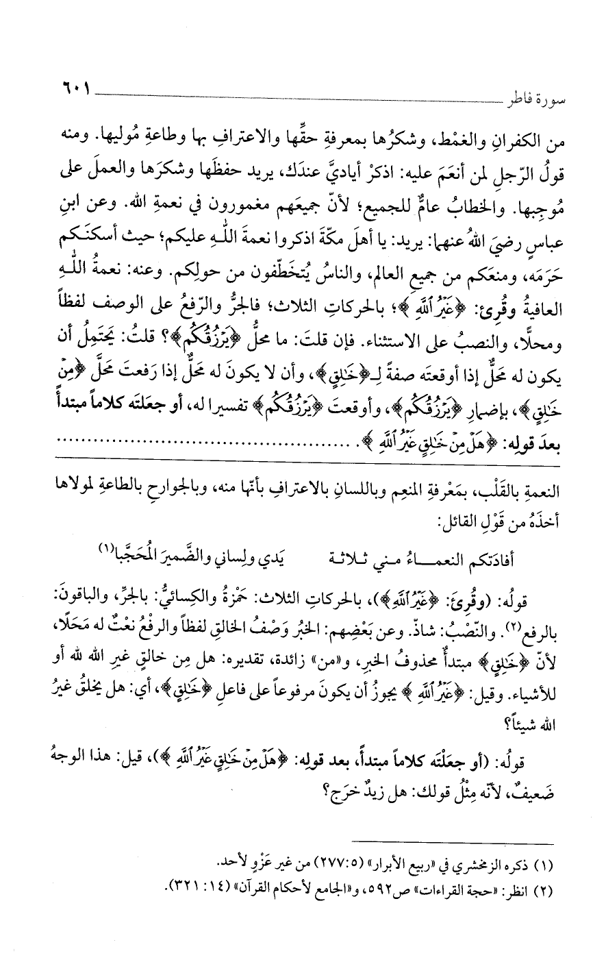 قولُه: (وقُرِئَ: {غَيْرُ اللهِ})، بالحركاتِ الثلاث: حَمْزةُ والكِسائيُّ: بالجرِّ، والباقونَ: بالرفع. والنّصْبُ: شاذّ. وعن بَعْضِهم: الخبرُ وَصْفُ الخالقِ لفظًا والرفْعُ نعْتٌ له مَحَلاً، لأنّ {خَالِقٍ} مبتدأٌ محذوفُ الخبرِ، و ((من)) زائدة، تقديره: هل مِن خالقٍ غيرِ الله الله أو للأشياء. وقيل: {غَيْرُ اللهِ} يجوزُ أن يكونَ مرفوعًا على فاعلِ {خَالِقٍ}، أي: هل يخلقُ غيرُ الله شيئًا؟