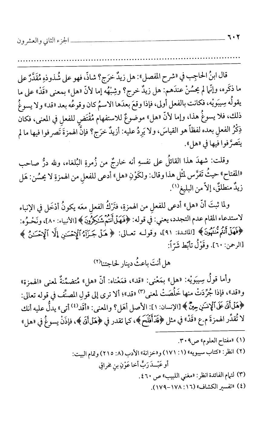 وأما قولُ سِيبَويْه: ((هل)) بمَعْنى: ((قد))، فمَعْناه: أنّ ((هل)) مَتضمِّنةٌ لمعنى ((الهمزة)) و ((قد))، فإذا جُرِّدَتْ منها خَلُصَتْ لمعنى ((قد))؛ ألا ترى إلى قولِ المصنِّف في قوله تعالى: {هَلْ أَتَى عَلَى الْإِنسَانِ حِينٌ} [الإنسان: 1]: الأصل أهَل؟ والمعنى: ((أقَد أتى)) يدلُّ عليه أنك لا تُقدِّر الهمزةَ م. ع ((قَدْ)) في مثل {قَدْ أَفْلَحَ}، كما تقدر في {هَلْ أَتَى}، فإذَنْ يسوغُ في ((هل))