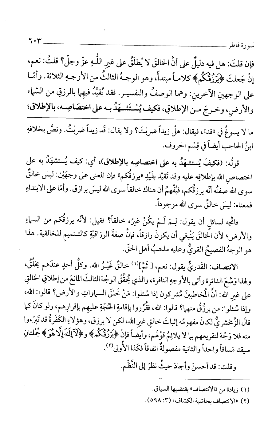 الانتصاف: القَدريُّ يقول: نعم، [ثَمَّ] خالقٌ غَيْرُ لله. وكلُّ أحدٍ عندَهم يخلُقُ، ولهذا وَسَّعَ الدائرة وأتى بالأوجهِ النافرة، والذي يُحقِّقُ الوجْهَ الثالثَ المانعَ من إطلاقِ الخالقِ على غيرِ الله: أنَّ المُخاطبينَ مُشركون إذا سُئلوا: مَنْ خَلقَ السماواتِ والأرض؟ قالوا: الله، وإذا سُئلوا: من يرزُقُ منهما؟ قالوا: الله، فقُرِّروا بإقامةِ الحُجّةِ عليهِم بإقرارِهم، ولو كانَ كما قالَ الزَّمخشريُّ لكانَ مفهومُه إثباتَ خالقٍ غيرِ الله، لكن لا يرزق، وهؤلاءِ الكَفَرةُ قد تَبرّءوا منه فلا لتقريعهم بما لا يلائِمُ قوْلَهم، وأيضًا فإنّ {يَرْزَقُكَم} و {لاَ إلَهَ إِلاَّ هُوَ} جَمْلتانِ سيقتا مَساقًا واحدًا والثانية مفصولةٌ اتفاقًا فكَذا الأُولى.