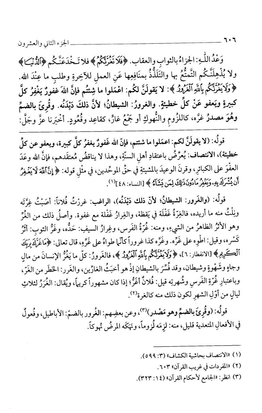 قولُه: (وقُرِئَ بالضمِّ وهو مَصْدر)، وعن بعضِهم: الغُرور بالضمّ: الأباطيل، وفُعولٌ في الأفعالِ المتعدية قليل، منه: لزِمَه لُزومًا، ونَهَكَه المرضُ نُهوكًا.