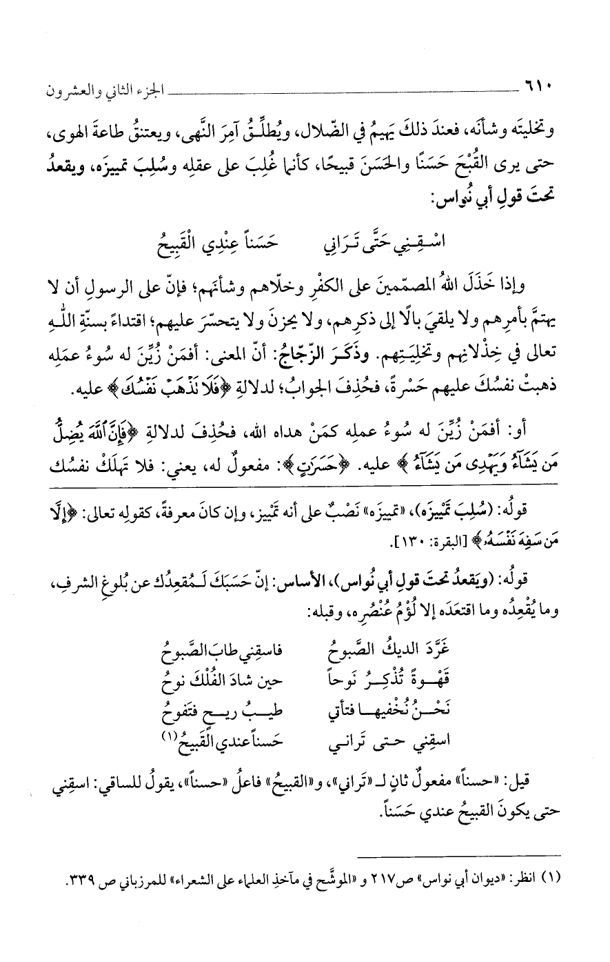 وتخليته وشأنه، فعند ذلك يهيم في الضلال، ويطلق آمر النهى، ويعتنق طاعة الهوى، حتى يرى القبح حسنًا والحسن قبيحًا، كأنما غلب على عقله وسلب تمييزه، ويقعد تحت قول أبى نواس: