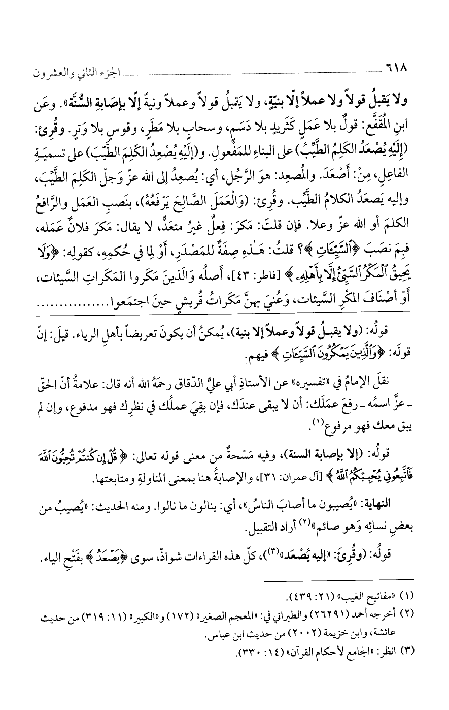 ولا يقبل قولًا ولا عملًا إلا بنيةٍ، ولا يقبل قولًا وعملًا ونيةً إلا بإصابة السنة». وعن ابن المقفع: قول بلا عمل كثريد بلا دسم، وسحاب بلا مطر، وقوس بلا وتر. وقرئ: (إِلَيْهِ يَصْعَدُ الْكَلِمُ الطَّيِّبُ) على البناء للمفعول. و (إِلَيْهِ يَصْعَدُ الْكَلِمُ الطَّيِّبُ) على تسمية الفاعل، من: أصعد. والمصعد: هو الرجل، أى: يصعد إلى الله عز وجل الكلم الطيب، وإليه يصعد الكلام الطيب. وقرئ: (وَالْعَمَلُ الصَّالِحُ يَرْفَعُهُ)، بنصب العمل والرافع الكلم أو الله عز وعلا. فإن قلت: مكر: فعل غير متعدّ، لا يقال: مكر فلان عمله، فبم نصب (السَّيِّئاتِ)؟ قلت: هذه صفة للمصدر، أو لما في حكمه، كقوله: (وَلا يَحِيقُ الْمَكْرُ السَّيِّئُ إِلَّا بِأَهْلِهِ)] فاطر: 43 [، أصله والذين مكروا المكرات السيئات، أو أصناف المكر السيئات، وعنى بهن مكرات قريش حين اجتمعوا