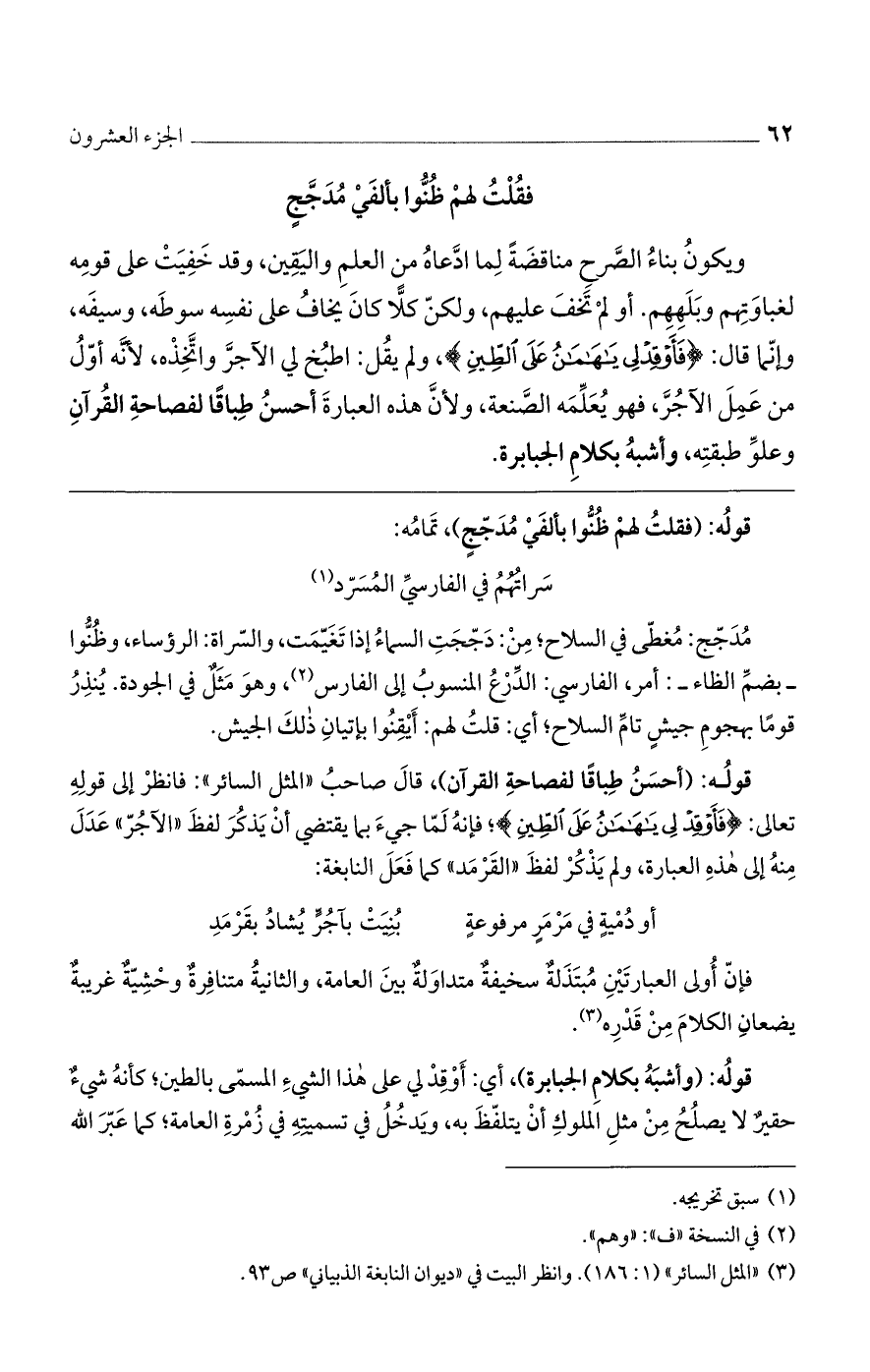 ويكونُ بناءُ الصَّرح مناقضَةً لِما ادَّعاهُ من العلمِ واليَقِين، وقد خَفِيَتْ على قومِه لغباوَتِهم وبَلَهِهِم. أو لمْ تَخفَ عليهم، ولكنّ كلاًّ كانَ يخافُ على نفسِه سوطَه، وسيفَه، وإنّما قال: {فَأَوْقِدْلِي يَاهَامَانُ عَلَى الطِّينِ}، ولم يقُل: اطبُخ لي الآجرَّ واتَّخِذْه، لأنَّه أوّلُ من عَمِلَ الآجُرَّ، فهو يُعَلِّمَه الصَّنعة، ولأنَّ هذه العبارةَ أحسنُ طِباقًا لفصاحةِ القُرآنِ وعلوِّ طبقتِه، وأشبهُ بكلامِ الجبابرة.
