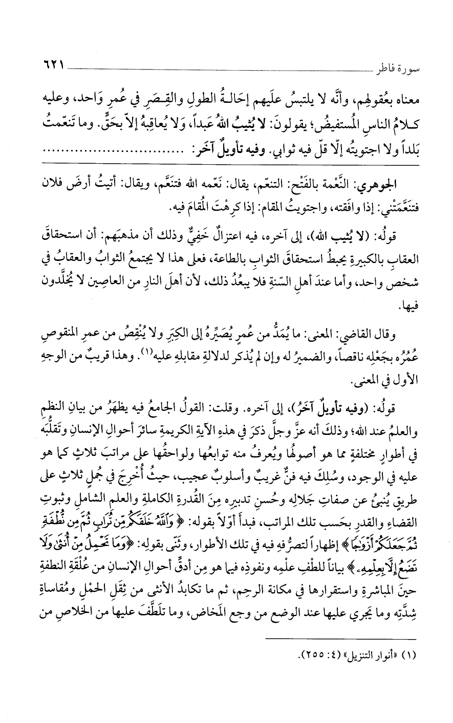 قولهُ: (وفيه تأويلٌ آخَرُ)، إلى آخره. وقلت: القولُ الجامعُ فيه يظهَرُ من بيانِ النظمِ والعلمُ عند الله؛ وذلكَ أنه عزَّ وجلَّ ذكرَ في هذهِ الآيةِ الكريمةِ سائرَ أحوالِ الإنسانِ وتَقلُّبَه في أطوارٍ مختلفةٍ مما هو أصولُها ويُعرفُ منه توابعُها ولواحقُها على مراتبَ ثلاثٍ كما هو عليه في الوجود، وسُلِكَ فيه فنٌّ غريبٌ وأسلوبٌ عجيب، حيثُ أُخْرِجَ في جُملٍ ثلاثٍ على طريقٍ يُنبئُ عن صفاتِ جَلالِه وحُسنِ تدبيرِه مِنَ القُدرةِ الكاملةِ والعلم الشاملِ وثبوتِ القضاءِ والقدرِ بحَسب تلك المراتب، فبدأَ أوّلاً بقوله: {وَاللَّهُ خَلَقَكُم مِّن تُرَابٍ ثُمَّ مِن نُّطْفَةٍ ثُمَّ جَعَلَكُمْ أَزْوَاجًا} إظهارًا لتصرُّفهِ فيه تلك الأطوار، وثَنّى بقولِه: {وَمَا تَحْمِلُ مِنْ أُنثَى وَلَا تَضَعُ إِلَّا بِعِلْمِهِ} بيانًا للطْفِ علْمِه ونفوذِه فيما هو مِن أدقِّ أحوالِ الإنسانِ من عُلْقَةِ النطفةِ حينَ المباشرةِ واستقرارها في مكانة الرحِم، ثم ما تكابدُ الأنثى من ثِقَلِ الحمْلِ ومُقاساةِ شِدَّتِه وما يَجري عليها عند الوضع من وجع المَخاض، وما تلَطَّفَ عليها من الخلاصِ من