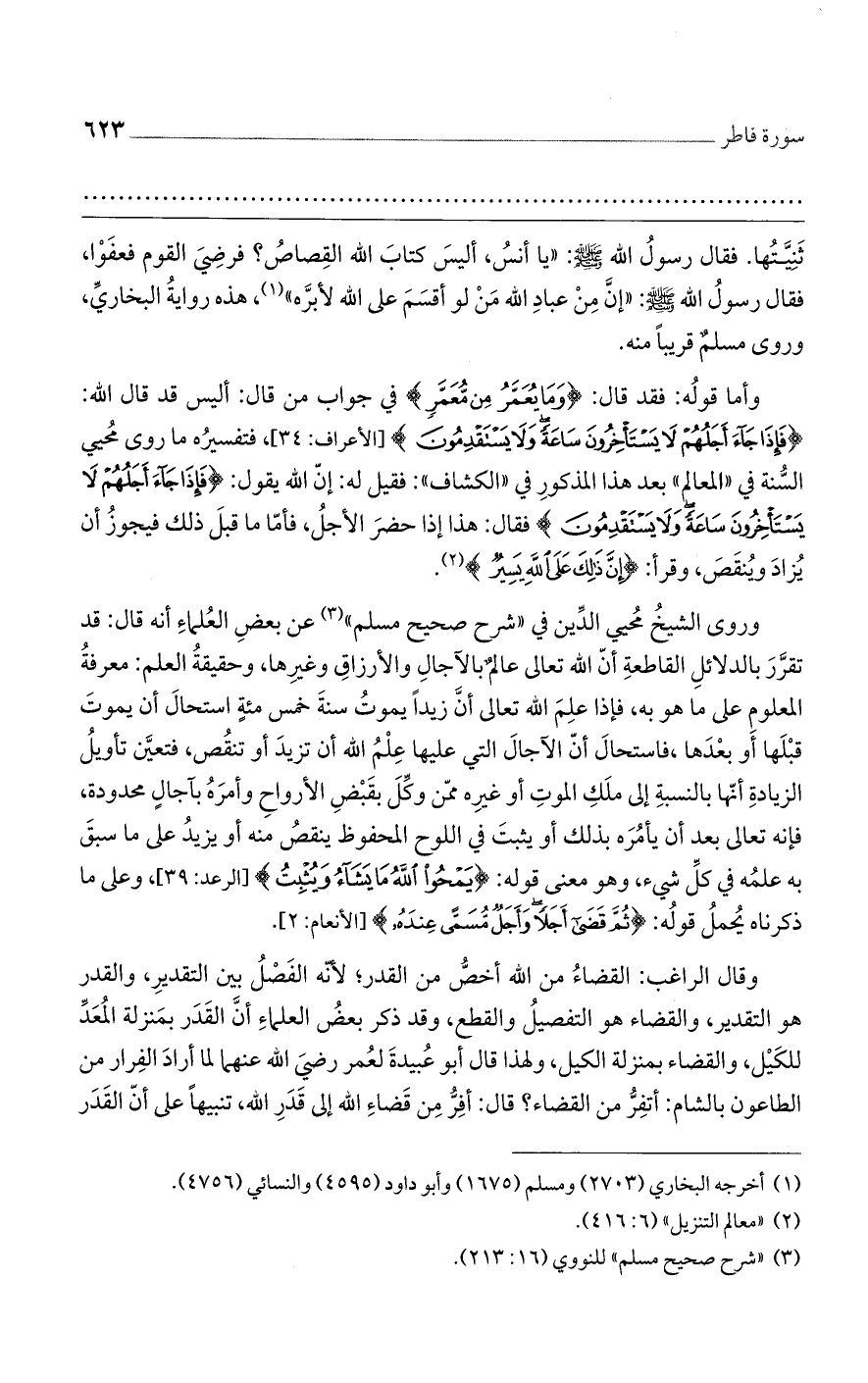 وأما قولُه: فقد قال: {وَمَا يُعَمَّرُ مِن مُّعَمَّرٍ} في جواب من قال: أليس قد قال الله: {فَإِذَا جَاءَ أَجَلُهُمْ لَا يَسْتَاخِرُونَ سَاعَةً وَلَا يَسْتَقْدِمُونَ} [الأعراف: 34]، فتفسيرُه ما روى مُحيي السُّنة في ((المعالم)) بعد هذا المذكورِ في ((الكشاف)): فقيل له: إنّ الله يقول: {فَإِذَا جَاءَ أَجَلُهُمْ لَا يَسْتَاخِرُونَ سَاعَةً وَلَا يَسْتَقْدِمُونَ} فقال: هذا إذا حضرَ الأجلُ، فأمّا ما قبلَ ذلك فيجوزُ أن يُزادَ ويُنقَصَ، وقرأ: {إِنَّ ذَلِكَ عَلَى اللَّهِ يَسِيرٌ}.