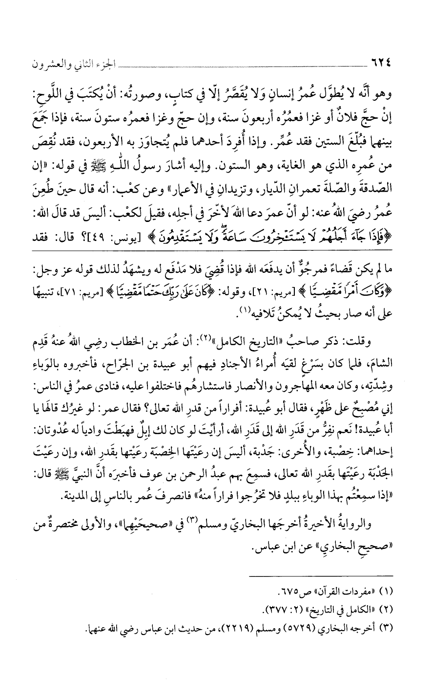 وقلت: ذكر صاحبُ ((التاريخ الكامل)): أن عُمَر بن الخطاب رضِي اللهُ عنهُ قَدِم الشامَ، فلما كان بسَرْغٍ لقيَه أُمراءُ الأجنادِ فيهم أبو عبيدة بن الجرّاح، فأخبروه بالوَباءِ وشِدّتِه، وكان معه المهاجرون والأنصار فاستشارهُم فاختلفوا عليه، فنادى عمرُ في الناس: إني مُصْبِحٌ على ظَهْرٍ، فقال أبو عُبيدة: أفرارًا من قدرِ الله تعالى؟ فقال عمر: لو غيرُك قالَها يا أبا عُبيدة! نَعم نفِرُّ من قَدَرِ الله إلى قَدَرِ الله، أرأيْتَ لو كان لك إبِلٌ فهَبَطْتَ واديًا له عُدْوتان: إحداهما: خِصْبة، والأُخرى: جَدْبة، أليسَ إن رعَيْتَها الخِصْبَة رعَيْتها بقَدرِ الله، وإن رعَيْتَ الجَدْبَة رعَيْتَها بقَدرِ الله تعالى، فسمِعَ بهم عبدُ الرحمن بن عوف فأخبرَه أنَّ النبيَّ صلى الله عليه وسلم قال: ((إذا سمِعْتُم بهذا الوباءِ ببلدٍ فلا تخرُجوا فرارًا منهُ)) فانصرفَ عُمر بالناسِ إلى المدينة.