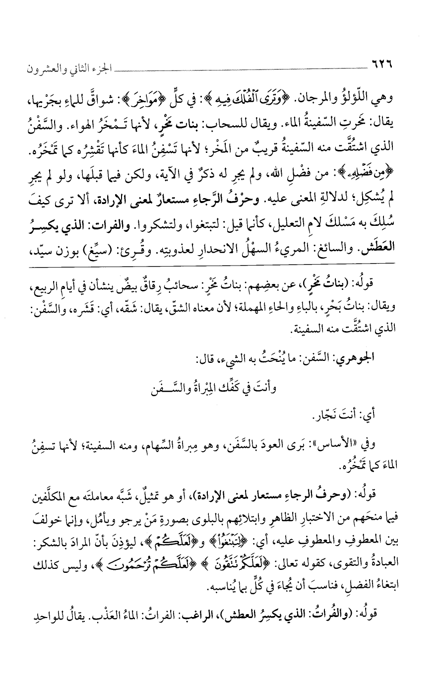 وهي اللؤلؤ والمرجان. (وَتَرَى الْفُلْكَ فِيهِ): في كل (مَواخِرَ): شواق للماء بجريها، يقال: مخرت السفينة الماء. ويقال للسحاب: بنات مخر، لأنها تمخر الهواء. والسفن الذي اشتقت منه السفينة قريب من المخر؛ لأنها تسفن الماء كأنها تقشره كما تمخره. (مِنْ فَضْلِهِ): من فضل الله، ولم يجر له ذكر في الآية، ولكن فيما قبلها، ولو لم يجر لم يشكل؛ لدلالة المعنى عليه. وحرف الرجاء مستعار لمعنى الإرادة، ألا ترى كيف سلك به مسلك لام التعليل، كأنما قيل: لتبتغوا، ولتشكروا. والفرات: الذي يكسر العطش. والسائغ: المريء السهل الانحدار لعذوبته. وقرئ: (سيغ) بوزن سيد،