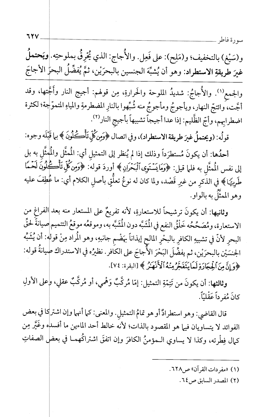 أحدُهما: أن يكونَ مُستطرَدًا وذلك إذا لم يُنظر إلى التمثيلِ أي: المُمثَّل والمُمثَّلِ به بل إلى نفس المُمثَّلِ به فلما قيل: {وَمَا يَسْتَوِي الْبَحْرَانِ} أوردَ قوله: {وَمِن كُلٍّ تَاكُلُونَ لَحْمًا طَرِيًّا} في الذكرِ من غيرِ قَصْد، ولما كان له نوعُ تعلَّقٍ بأصلِ الكلام أي: ما عُطِفَ عليه وهو الممثَّلُ به بالواو.