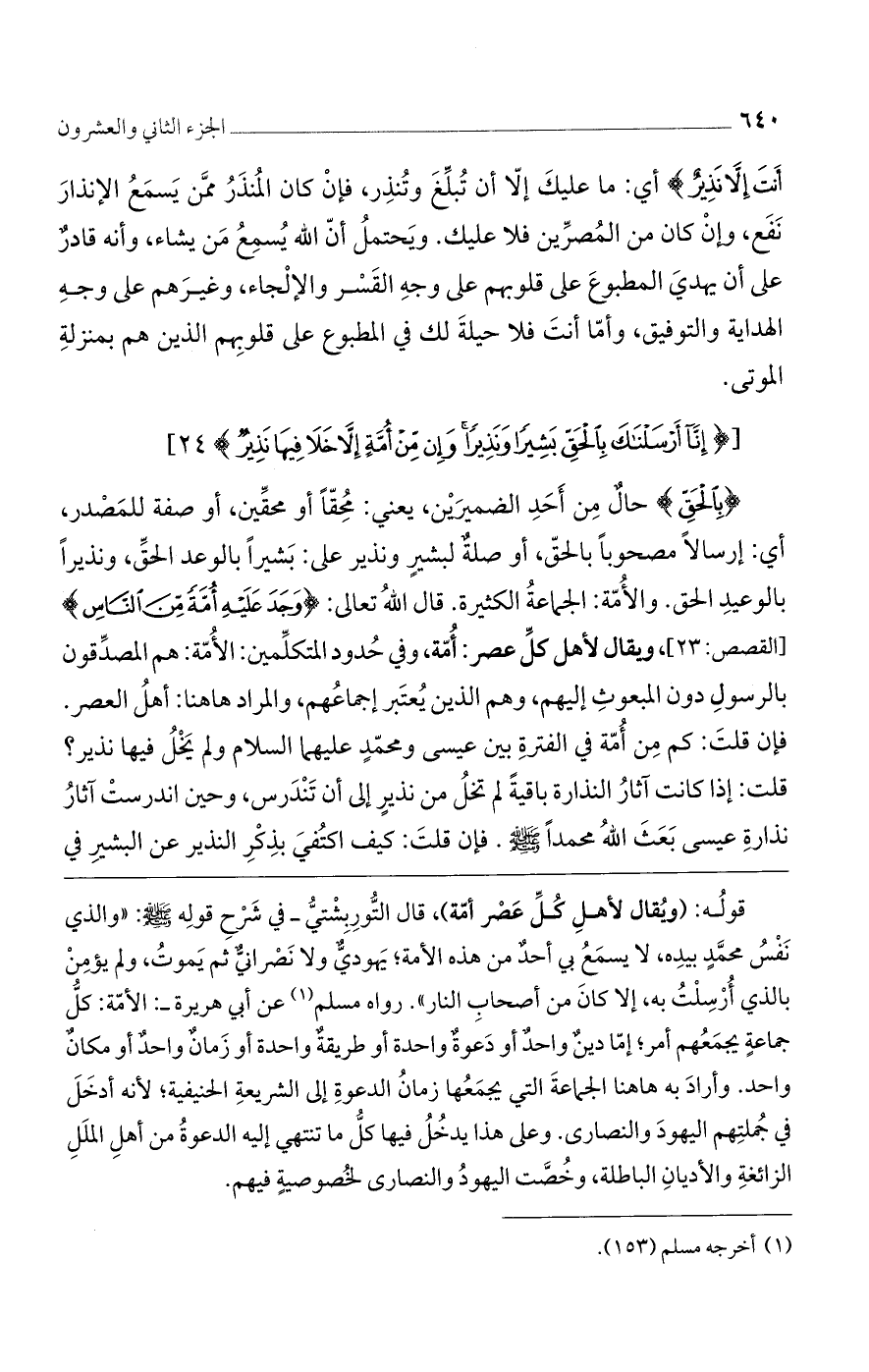 [(إِنَّا أَرْسَلْناكَ بِالْحَقِّ بَشِيراً وَنَذِيراً وَإِنْ مِنْ أُمَّةٍ إِلاَّ خَلا فِيها نَذِيرٌ)] 24 [