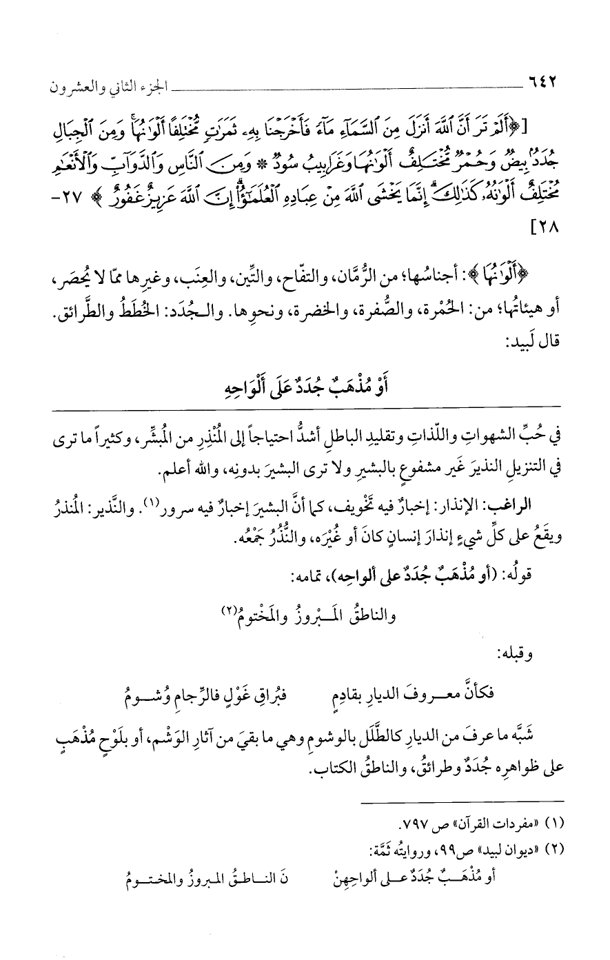 [(أَلَمْ تَرَ أَنَّ الله أَنْزَلَ مِنَ السَّماءِ ماءً فَأَخْرَجْنا بِهِ ثَمَراتٍ مُخْتَلِفاً أَلْوانُها وَمِنَ الْجِبالِ جُدَدٌ بِيضٌ وَحُمْرٌ مُخْتَلِفٌ أَلْوانُها وَغَرابِيبُ سُودٌ (27) وَمِنَ النَّاسِ وَالدَّوَابِّ وَالْأَنْعامِ مُخْتَلِفٌ أَلْوانُهُ كَذلِكَ إِنَّما يَخْشَى الله مِنْ عِبادِهِ الْعُلَماءُ إِنَّ الله عَزِيزٌ غَفُورٌ)] 27 - 28 [