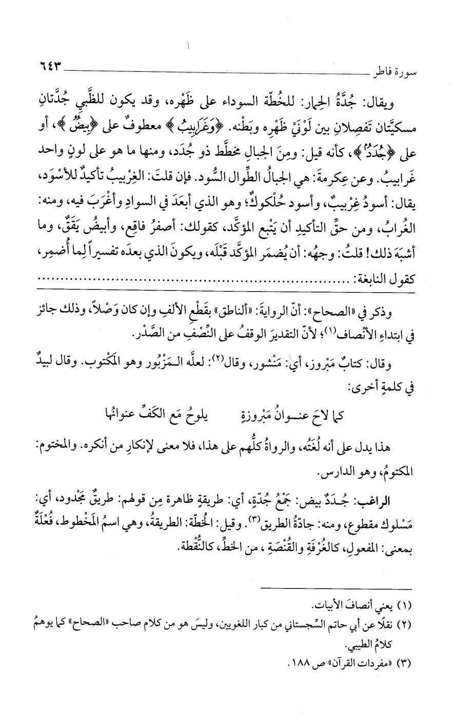ويقال: جدة الحمار: للخطة السوداء على ظهره، وقد يكون للظبي جدتان مسكيتان تفصلان بين لوني ظهره وبطنه. (وَغَرابِيبُ) معطوف على (بيض)، أو على (جدد)، كأنه قيل: ومن الجبال مخطط ذو جدد، ومنها ما هو على لون واحد غرابيب. وعن عكرمة: هي الجبال الطوال السود. فإن قلت: الغربيب تأكيد للأسود، يقال: أسود غربيب، وأسود حلكوك؛ وهو الذي أبعد في السواد وأغرب فيه، ومنه: الغراب، ومن حق التأكيد أن يتبع المؤكد، كقولك: أصفر فاقع، وأبيض يقق، وما أشبه ذلك! قلت: وجهه: أن يضمر المؤكد قبله، ويكون الذي بعده تفسيرًا لما أضمر، كقول النابغة:
