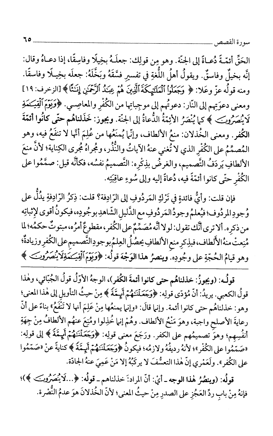 الحَقِّ أئمّةً دُعاةً إلى الجنّة. وهو مِن قولِك: جعلَهُ بخِيلاً وفاسِقًا، إذا دعاهُ وقال: إنَّه بخيلٌ وفاسقٌ. ويقولُ أهلُ اللُّغةِ في تفسيرِ فسَّقَهُ وبَخَّلَهُ: جعلَه بخِيلاً وفاسقًا. ومنه قولُه عزّ وعَلا: {وَجَعَلُوا المَلَائِكَةَ الَّذِينَ هُمْ عِبَادُ الرَّحْمَنِ إِنَاثًا} [الزخرف: 19] ومعنى دعوَتِهم إلى النّار: دعوتُهم إلى موجِباتِها من الكُفْرِ والمعاصِي. {وَيَوْمَ اَلْقِيَامَةِ لاَ يُنصَرُونَ} كما يُنْصَرُ الأئِمّةُ الدُّعاةُ إلى الجنّة. ويجوز: خَذَلناهُم حتّى كانُوا أئمّةَ الكُفر. ومعنى الخُذلان: منعُ الألطاف، وإنّما يُمنَعُها من عُلِمَ أنَّها لا تنفَعُ فيه، وهو المُصمِّمُ على الكُفْرِ الذي لا تُغني عنهُ الآياتُ والنُّذُر، ومُجراهُ مُجرى الكِناية؛ لأنَّ منعَ الألطافِ يَردَفُ التَّصميم، والغرضُ بذِكْرِه: التَّصميمُ نفسُه، فكأنَّه قيل: صمَّمُوا على الكُفْرِ حتّى أئمّةً فيه، دُعاةً إليه وإلى سُوءِ عاقِبَتِه.