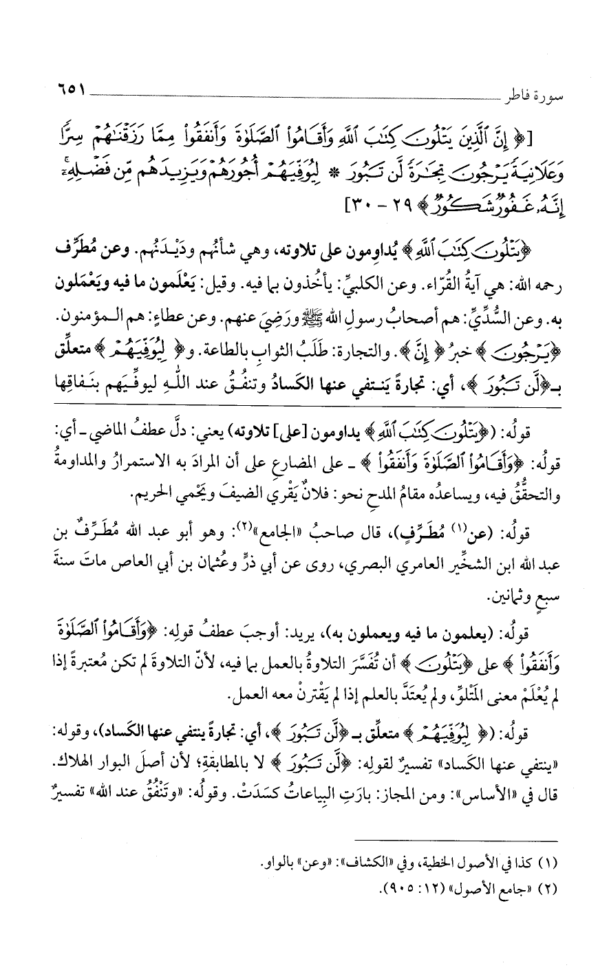 [(إِنَّ الَّذِينَ يَتْلُونَ كِتابَ الله وَأَقامُوا الصَّلاةَ وَأَنْفَقُوا مِمَّا رَزَقْناهُمْ سِرًّا وَعَلانِيَةً يَرْجُونَ تِجارَةً لَنْ تَبُورَ (29) لِيُوَفِّيَهُمْ أُجُورَهُمْ وَيَزِيدَهُمْ مِنْ فَضْلِهِ إِنَّهُ غَفُورٌ شَكُورٌ)] 29 - 30 [