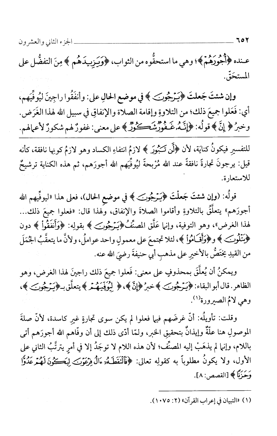 قولُه: (وإن شئتَ جَعلْتَ {يَرْجُونَ} في موضعِ الحال)، فعلى هذا ((ليوفِّيهم الله أجورَهم)) يتعلَّقُ بالتلاوةِ وأقاموا الصلاةَ والإنفاق، ولهذا قال: ((فعلوا جميعَ ذلك .... لهذا الغرض))، وهو التوفيه، وإنما عَلَّق المصنِّفُ {يَرْجُونَ} بقولِه: {وَأَنفَقُوا} دون {يَتْلُونَ} و {وَأَقَامُوْ}، لئلا تجتمعَ على معمولٍ واحد عواملُ، ولأنَّ ما يتعقَّبُ الجُمَلَ من القيدِ يختَصُّ بالأخيرِ على مذهبِ أبي حنيفةَ رضيَ الله عنه.